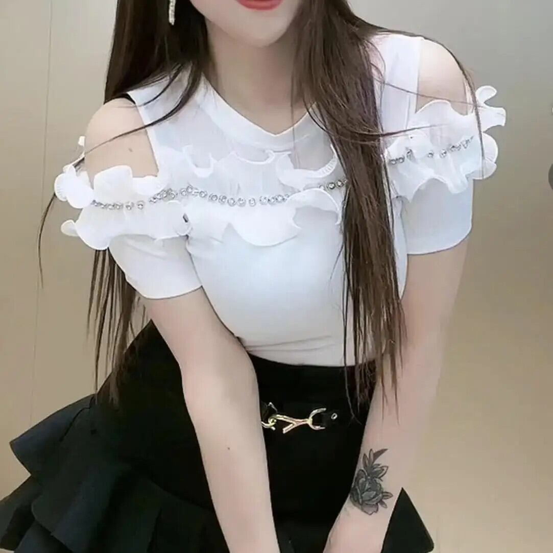 送料無料 O ネックフリルビーズオフショルダー Tシャツ女性の 2024 夏ルーズオールマッチトップスオフィスレディ Tシャツ ラッフル サマー 夏物 Oネック 会社 学校 通勤や通学にも AE1288776636779116035