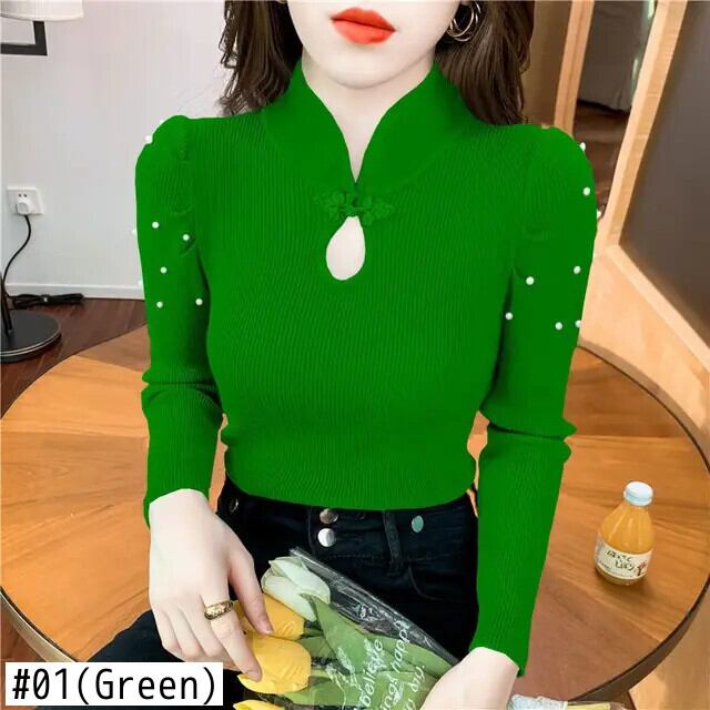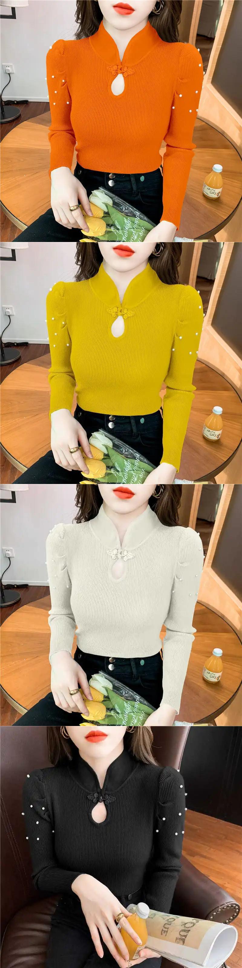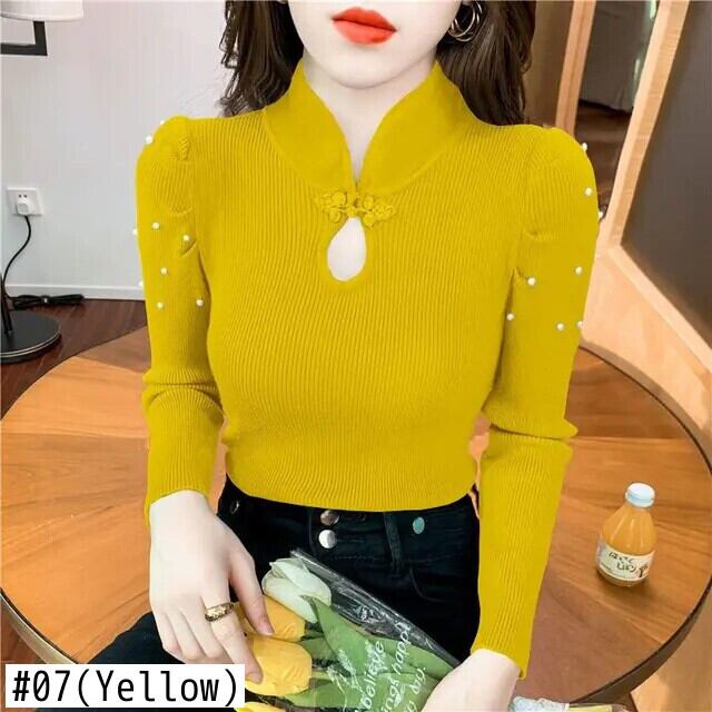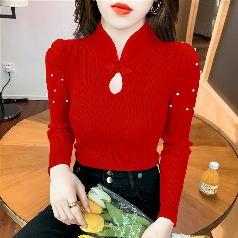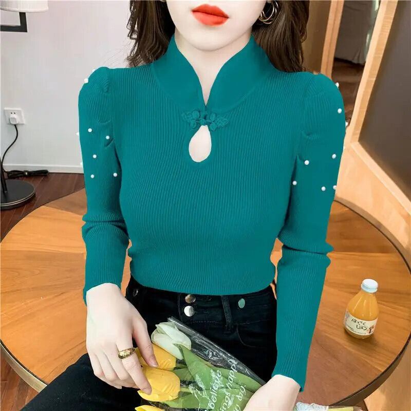 送料無料 ソリッドカラーボタンビーズ中空アウトブラウス女性の 2023 秋冬スリムトップスパフスリーブシャツ オータム 秋物 ウィンター 冬物 AE1288776676017768105