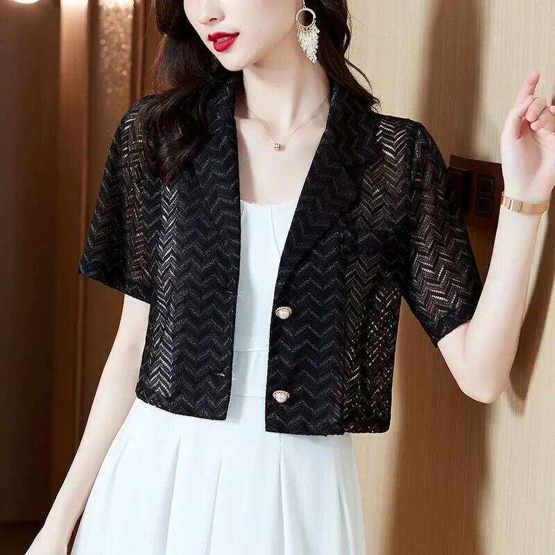 送料無料 V ネックスプライスボタン中空アウトレースシャツ女性の 2023 夏トップスオールマッチオフィスレディブラウス サマー 夏物 Vネック 会社 学校 通勤や通学にも AE1288776641044547