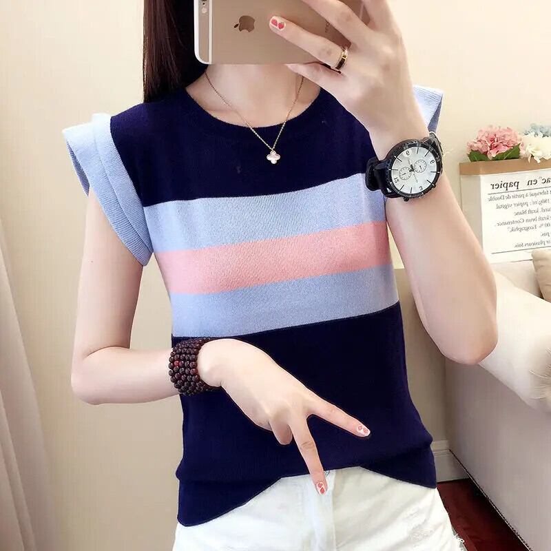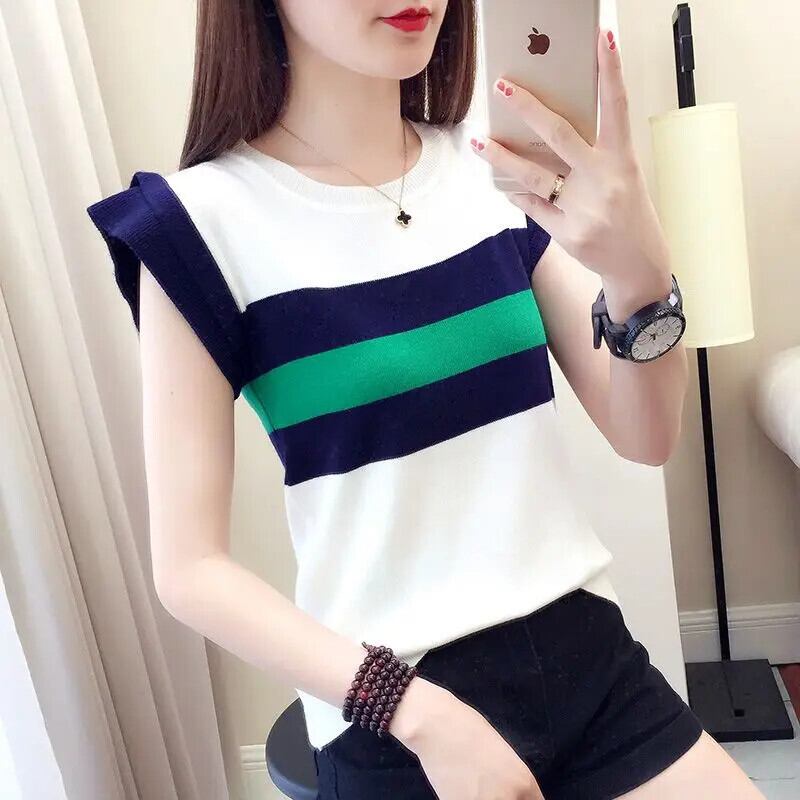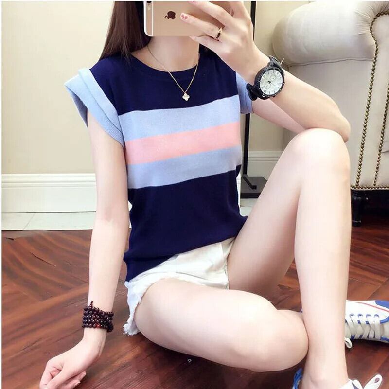 送料無料 プリントスプライス O ネックストライプブラウス女性の 2023 夏プルオーバーオールマッチ半袖シャツ ショート ハーフスリーブ サマー 夏物 Oネック AE1288776656738996541