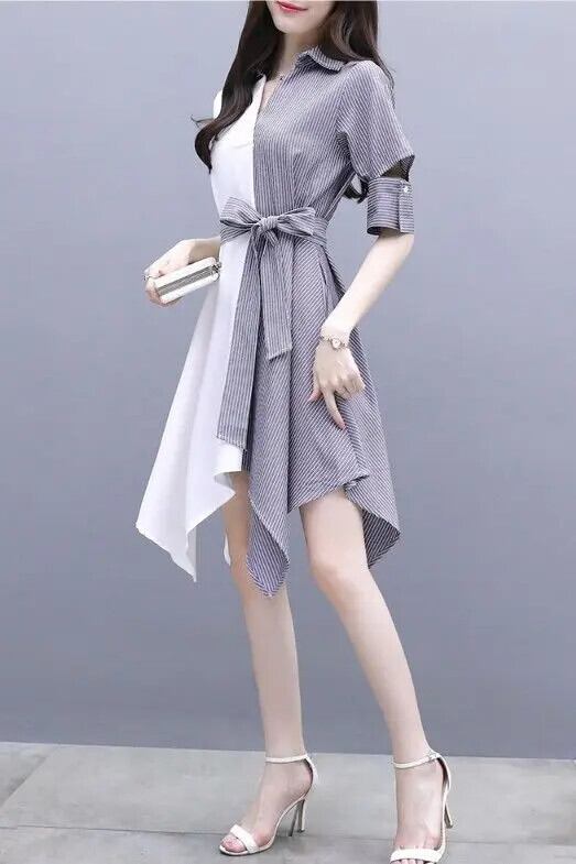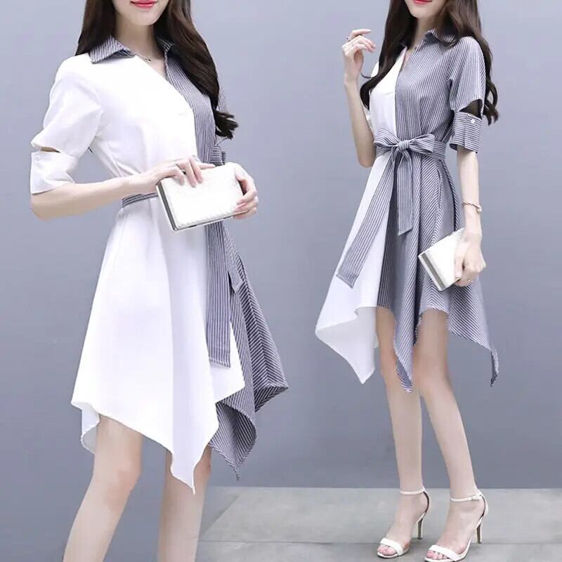 送料無料 ストライプスプライシング包帯弓非対称ドレス女性 2024 夏緩い不規則なミニドレス リボン サマー 夏物 AE1288776641928947483