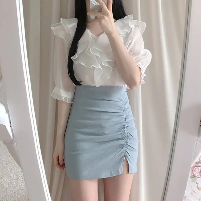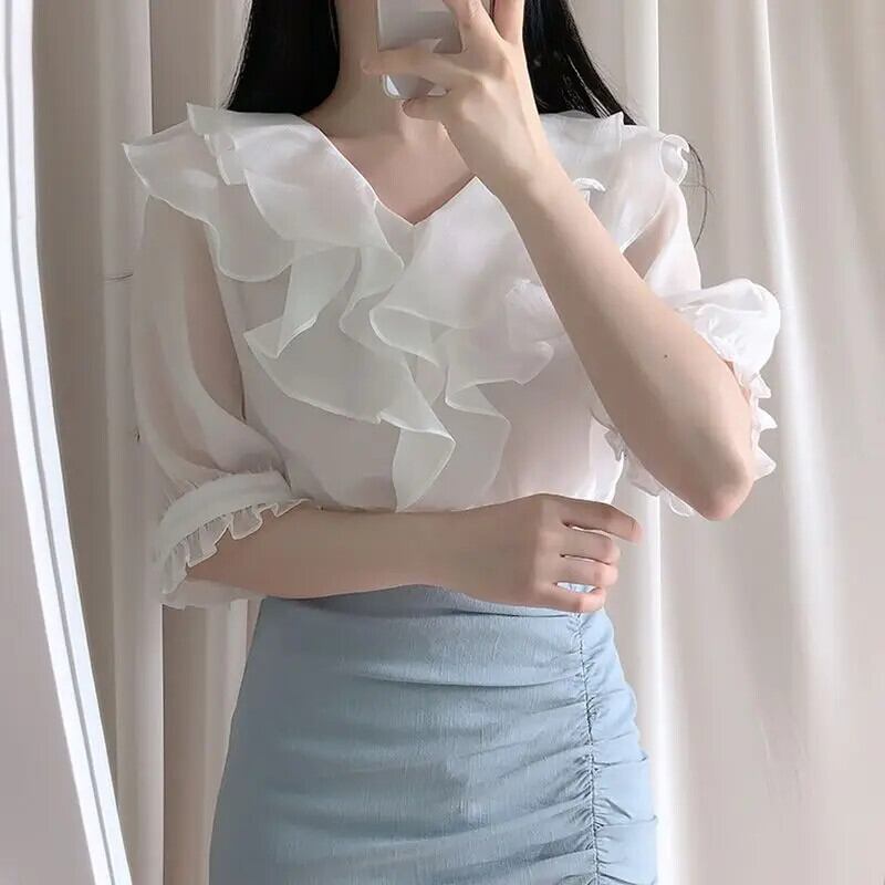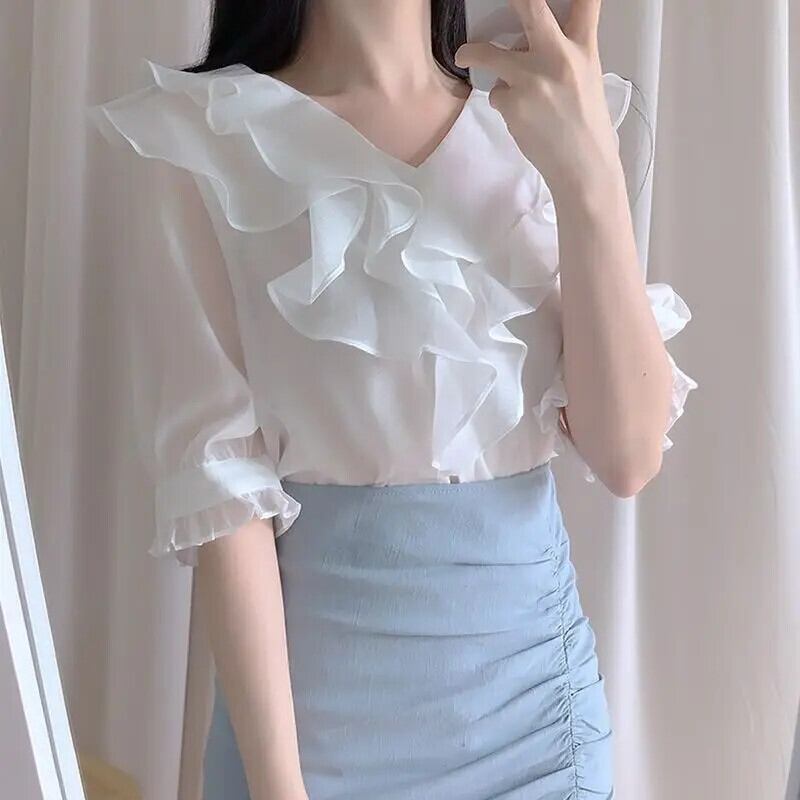 送料無料 V ネックスプライス花びら袖フリルブラウス女性の 2023 夏プルオーバールーズスイートシャツ ラッフル 大人ガーリー スウィート キュート カジュアル サマー 夏物 Vネック AE1288776629791465143