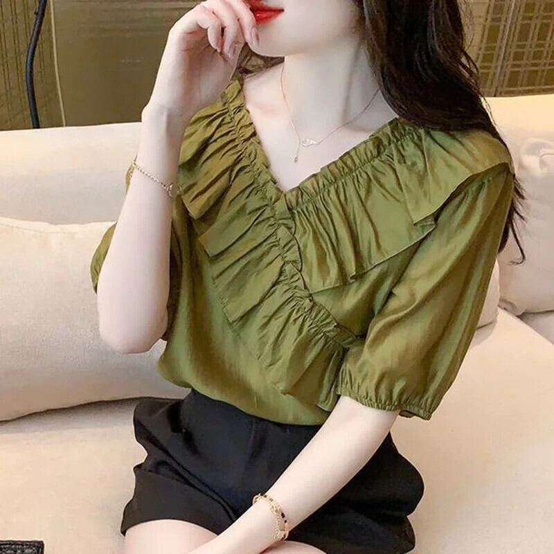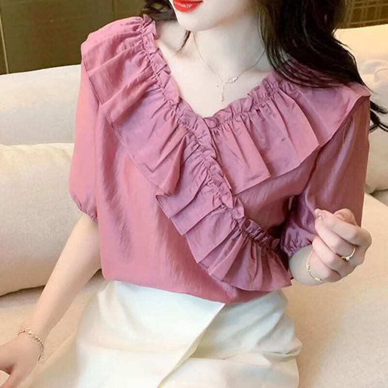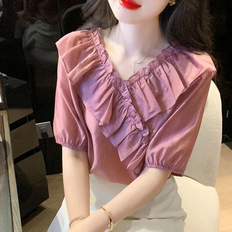 送料無料 甘いソリッドカラースプライシング非対称フリルブラウス2023夏プルオーバーパフスリーブシャツ ラッフル 大人ガーリー スウィート キュート カジュアル サマー 夏物 AE1288776630807116906
