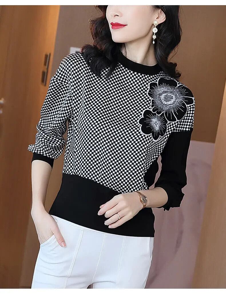 送料無料 スタイリッシュなプリントスプライシング刺繍花柄ブラウス女性の 2024 春プルオーバールーズ通勤シャツ スプリング 春物 AE1288776638130025535