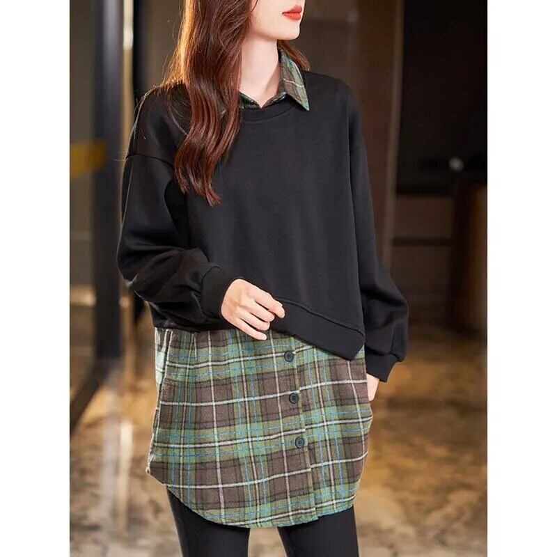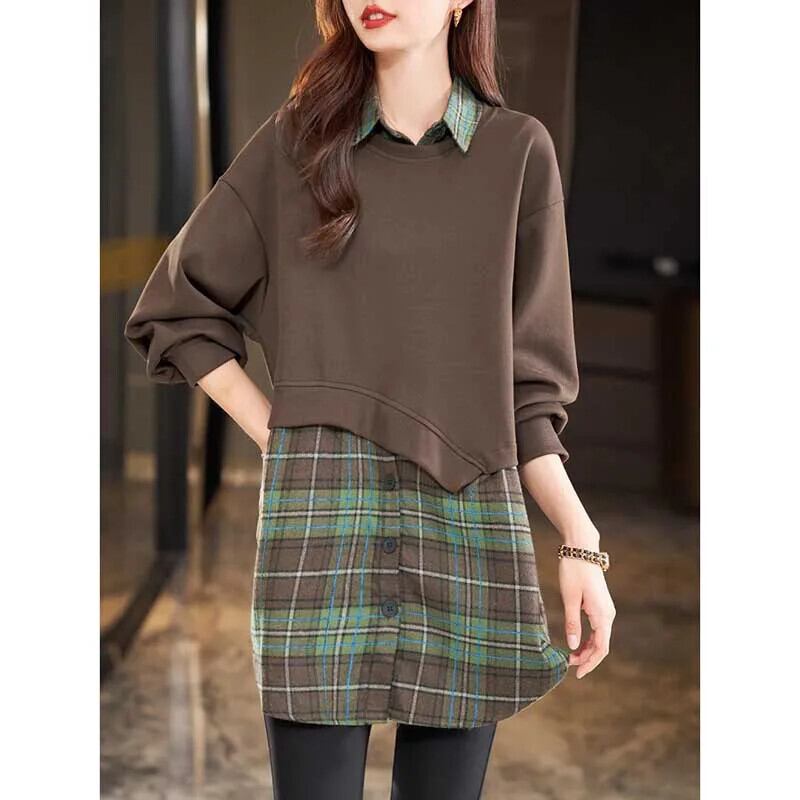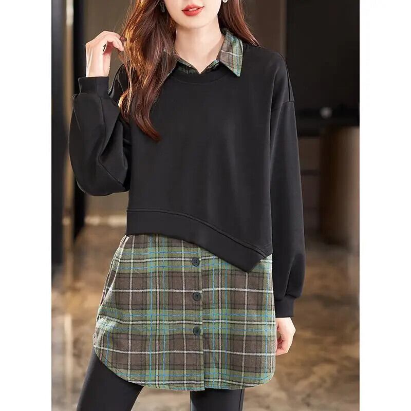 送料無料 ラペルスプライスフェイクツーピースチェック柄ブラウス女性の 2023 秋冬ルーズトップス非対称シャツ オータム 秋物 ウィンター 冬物 AE1288776684227749310