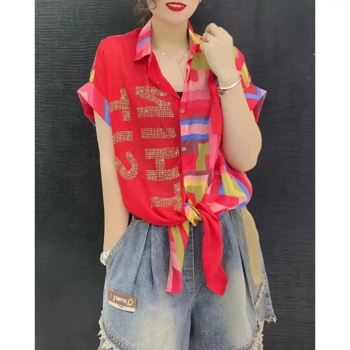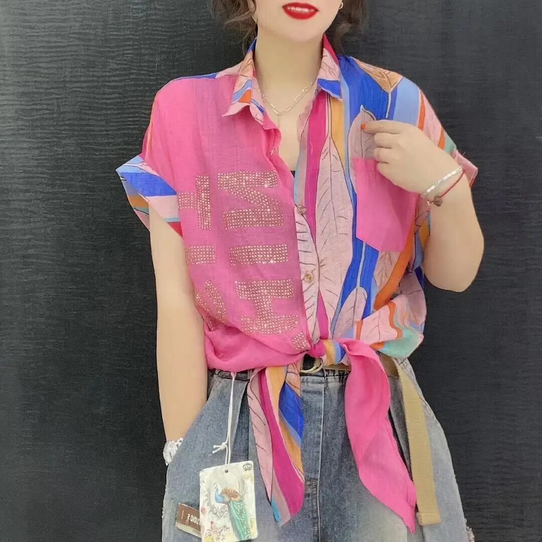 送料無料 ヴィンテージラペルダイヤモンドプリントシフォンブラウスプラスサイズスタイリッシュな通勤半袖シャツ夏ルーズ ショート ハーフスリーブ 大きめサイズ サマー 夏物 ビンテージ AE1288776691769251773