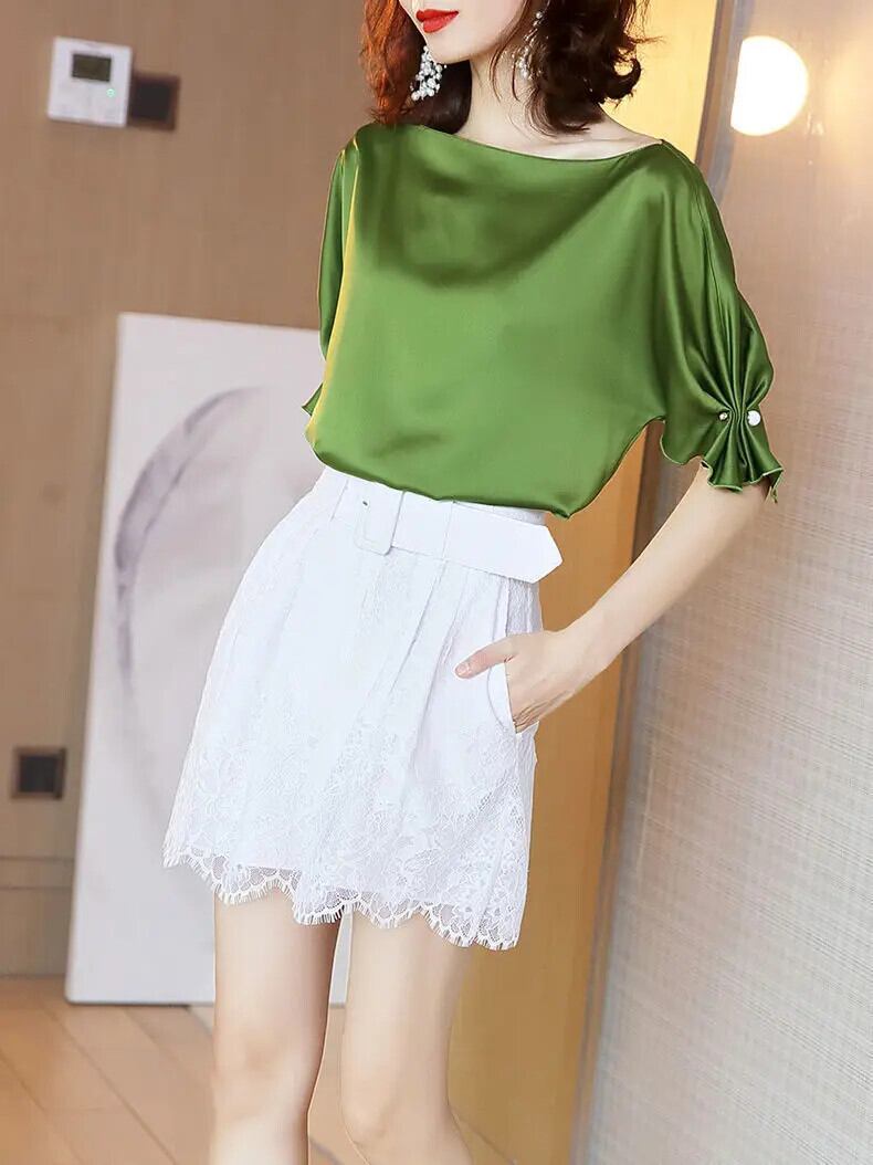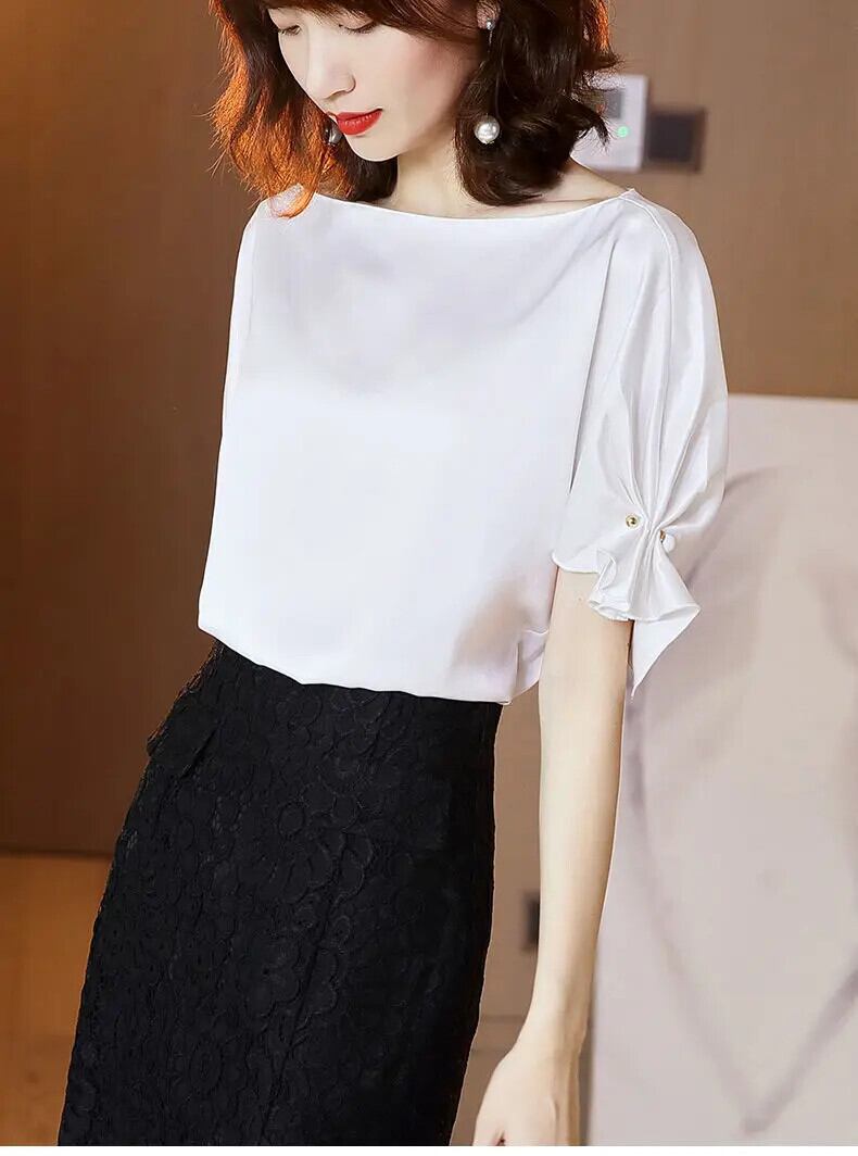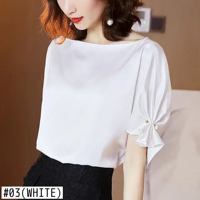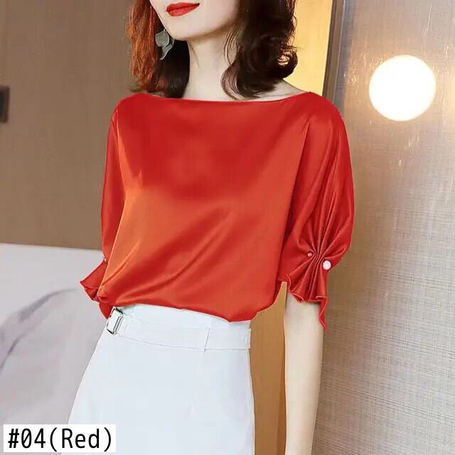 送料無料 ビーズ スラッシュネック サテン シャツ レディース 2022 春 オフィスレディ ラグラン 五分袖 プルオーバー ブラウス 半袖 ハーフスリーブ スプリング 春物 会社 学校 通勤や通学にも AE1288776697046326122