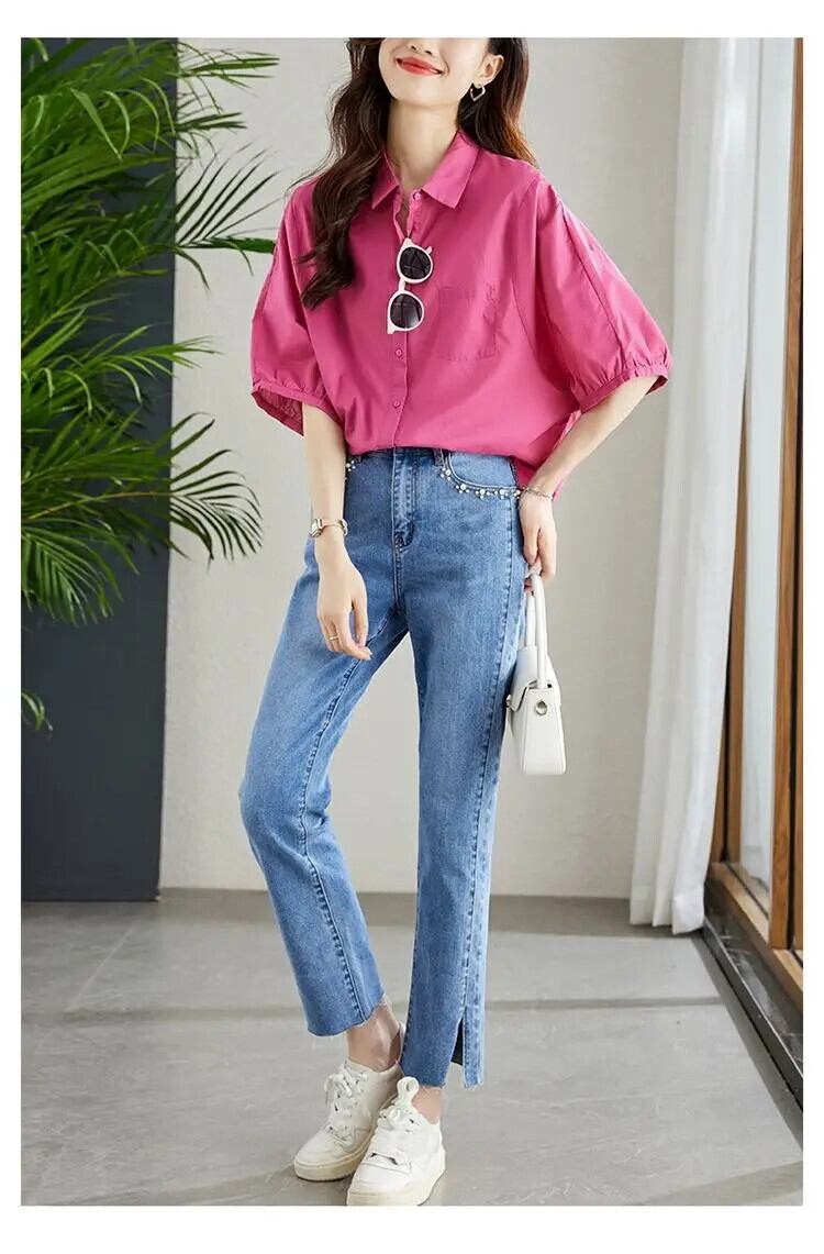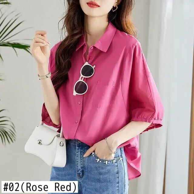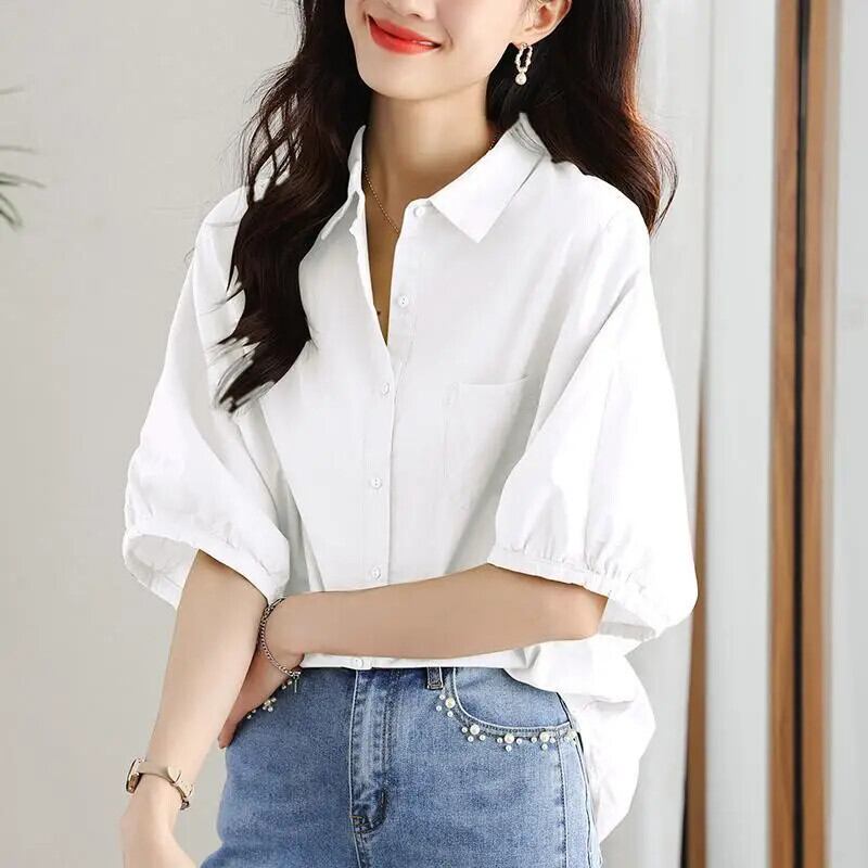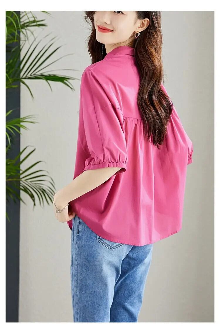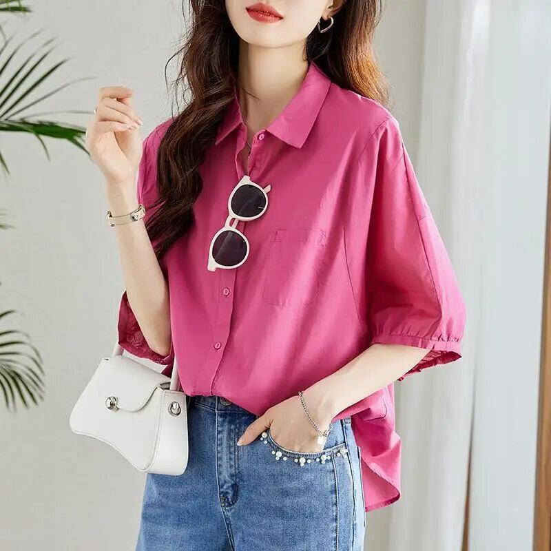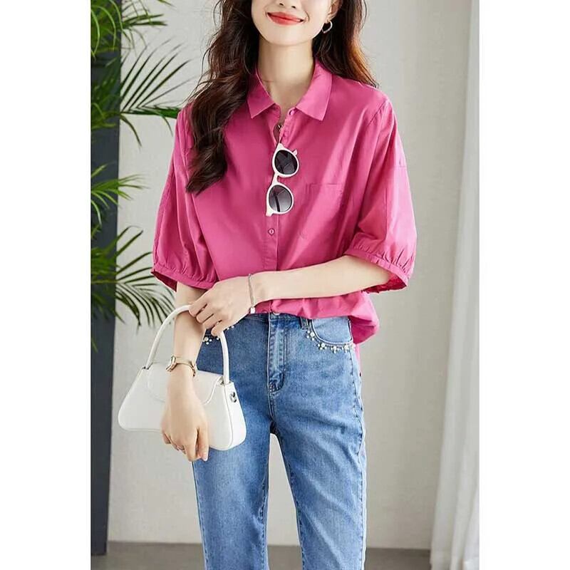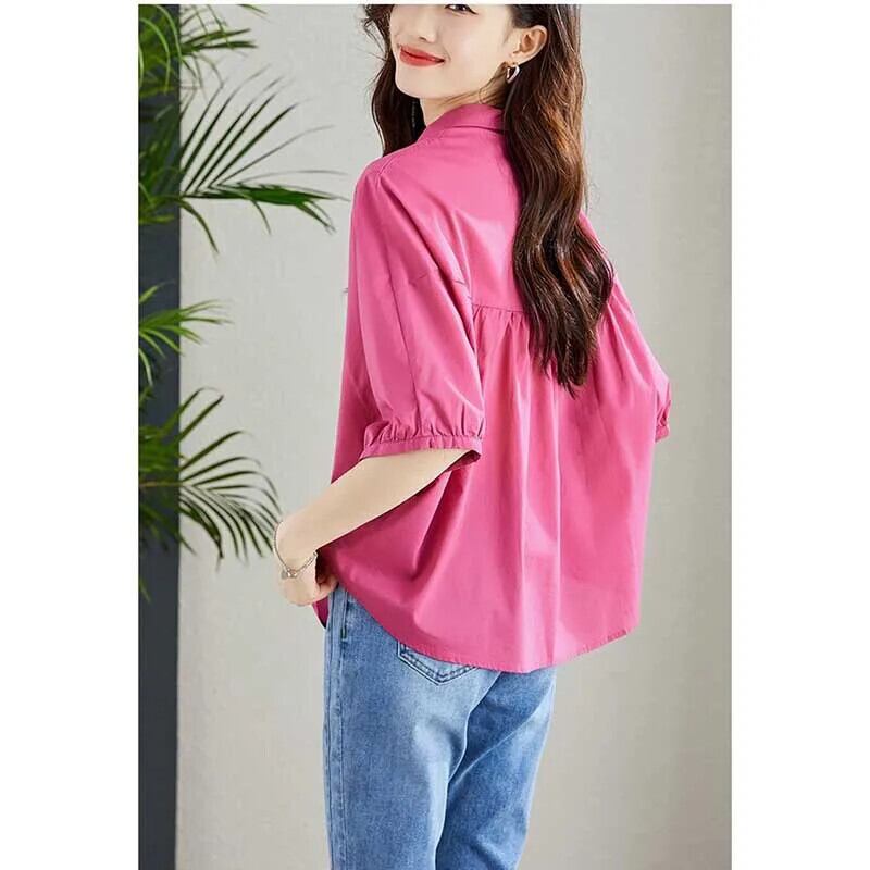 送料無料 ラペルソリッドカラーひだランタンスリーブシャツ女性の 2024 春夏ルーズトップスブラウス スプリング 春物 サマー 夏物 AE1288776697546052191