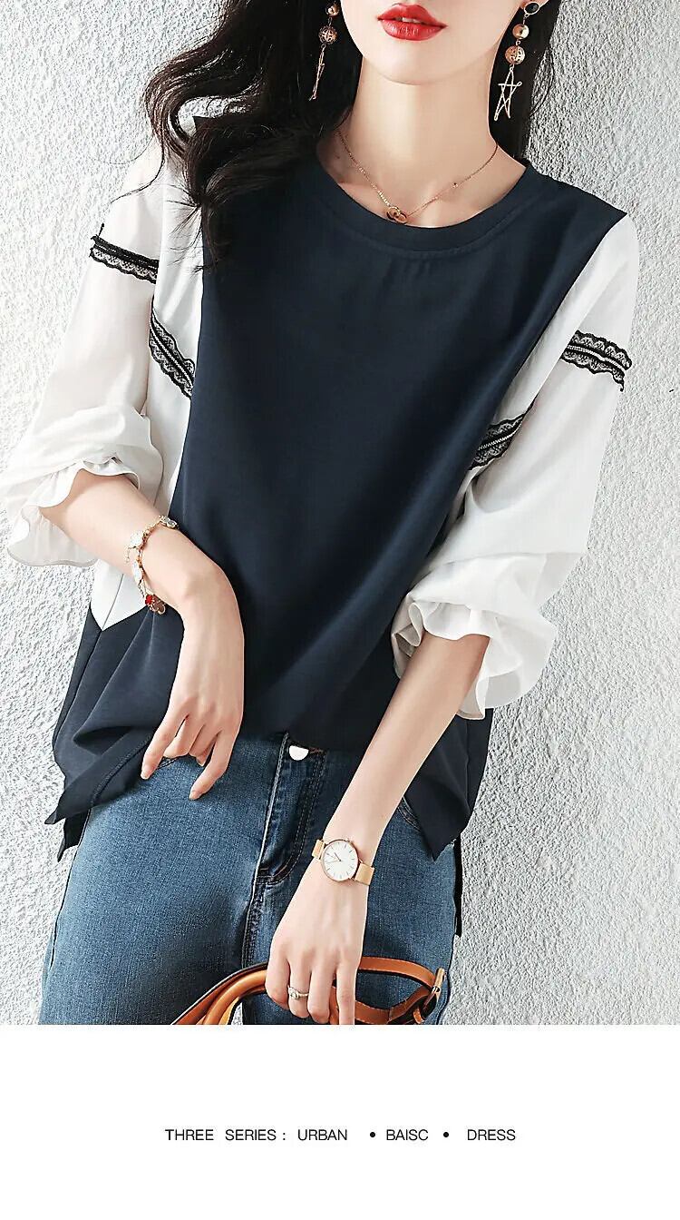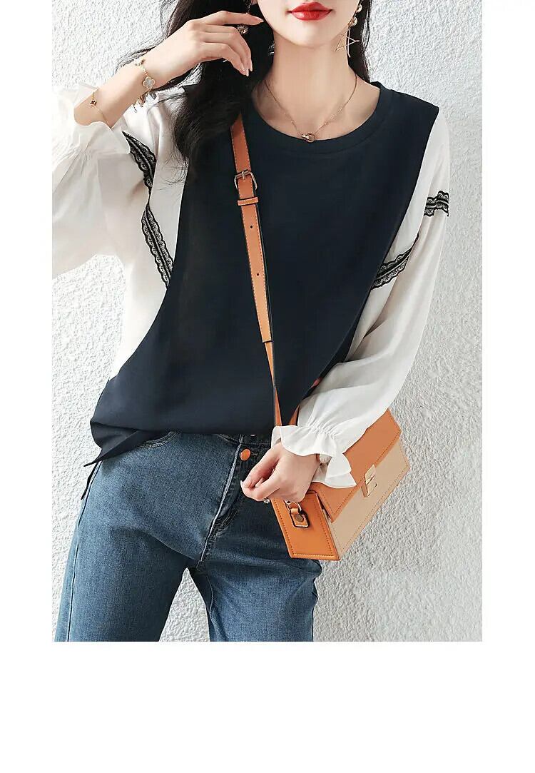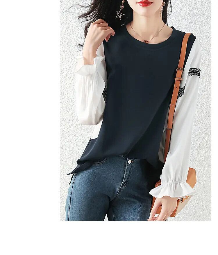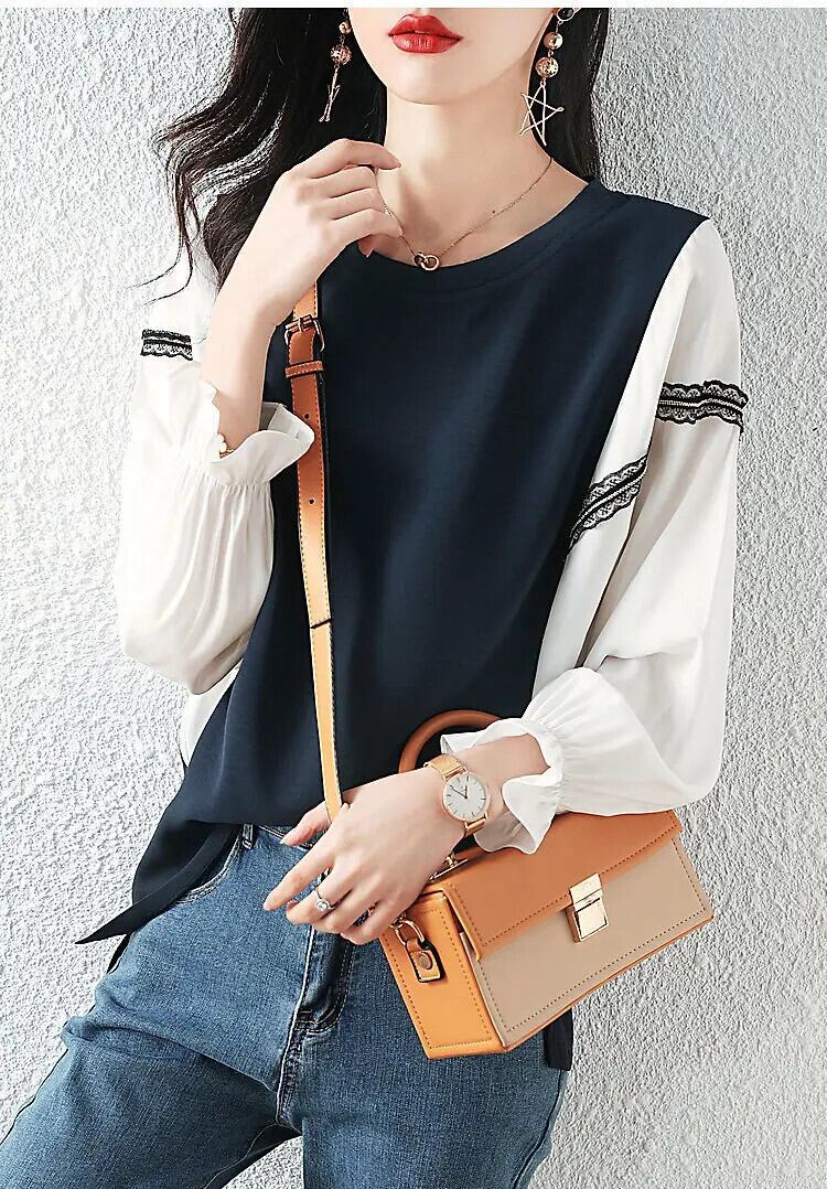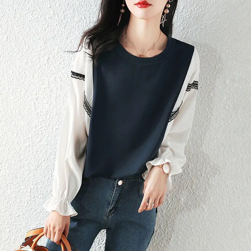 送料無料 O ネックスプライスレーススリーブシャツルーズプルオーバー 2022 秋の女性の通勤ブラウス オータム 秋物 Oネック AE1288776655883509608
