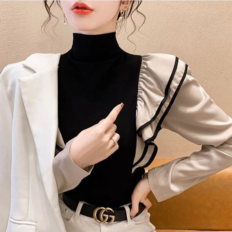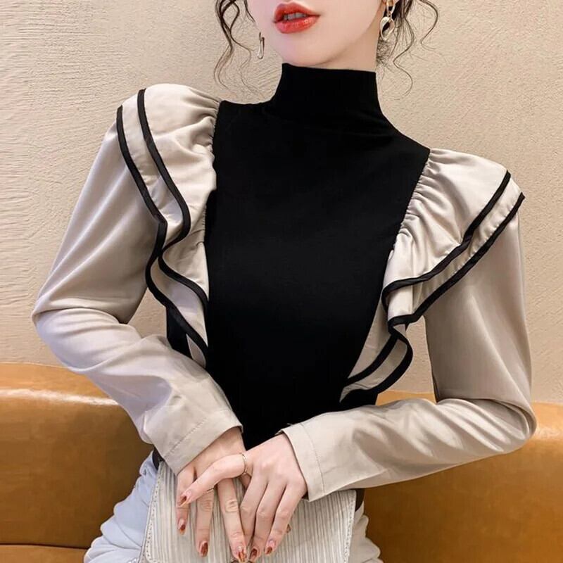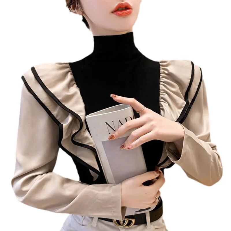 送料無料 スタイリッシュなタートルネックスプライシング折り目フリルブラウス 2023 秋プルオーバーオールマッチオフィスレディシャツ ラッフル オータム 秋物 会社 学校 通勤や通学にも AE1288776690579042536