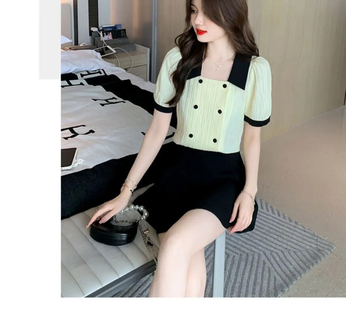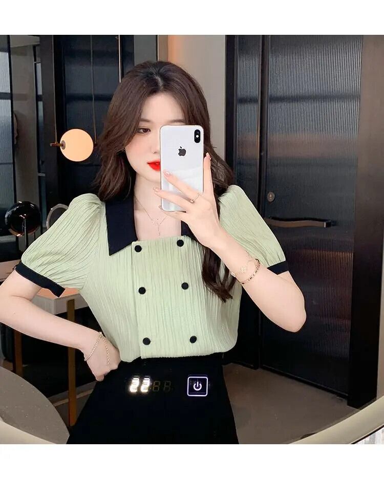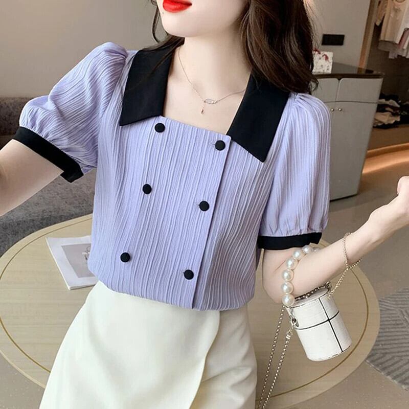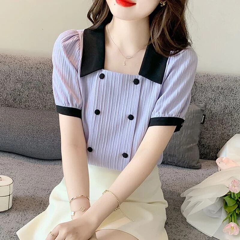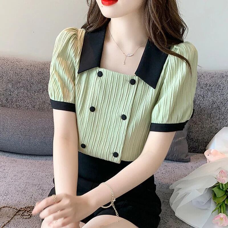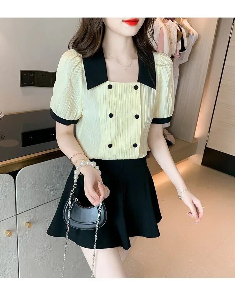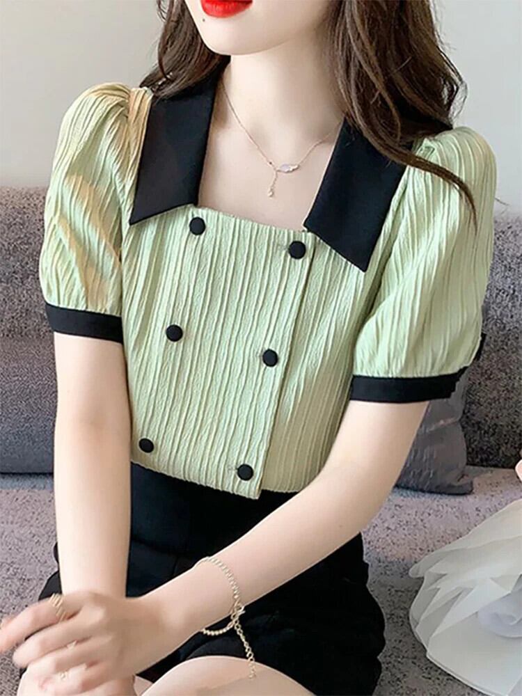 送料無料 甘いラペルボタンスプライシングソリッドカラーパフスリーブシャツ女性の 2024 夏ルーズオールマッチトップスブラウス 大人ガーリー スウィート キュート カジュアル サマー 夏物 AE1288776694793813617