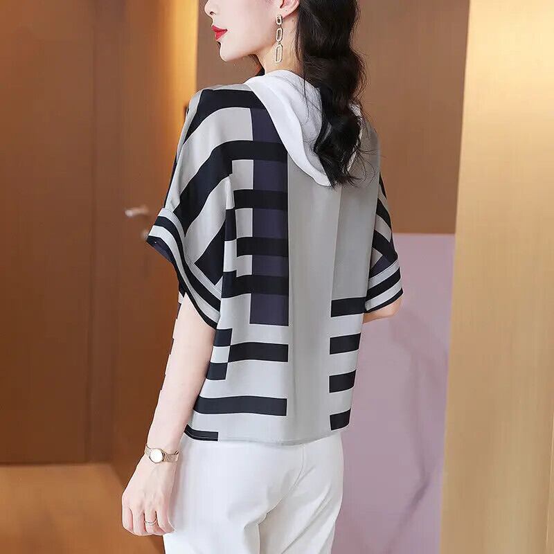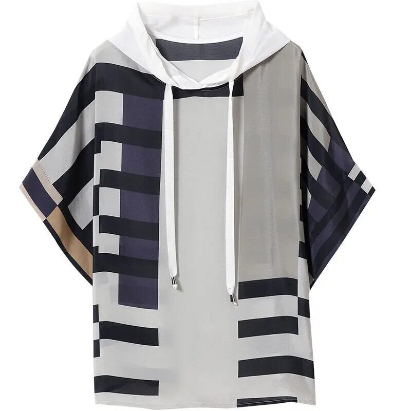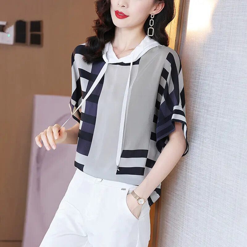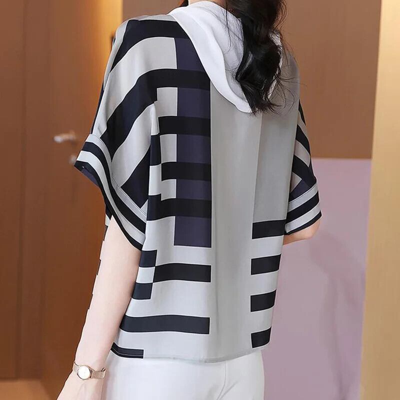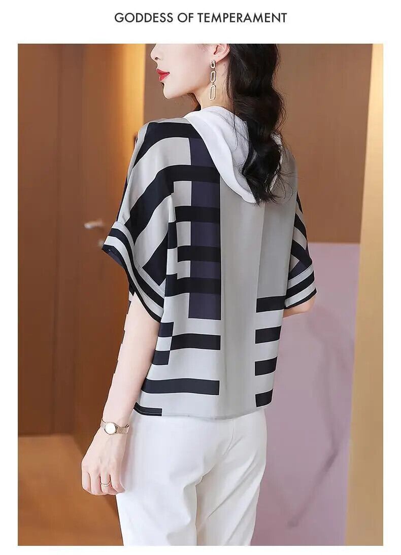 送料無料 ストライプスプライシング緩い巾着フード付き Tシャツ女性 2022 夏通勤半袖プルオーバートップス ハーフスリーブ サマー 夏物 AE1288776650938148779
