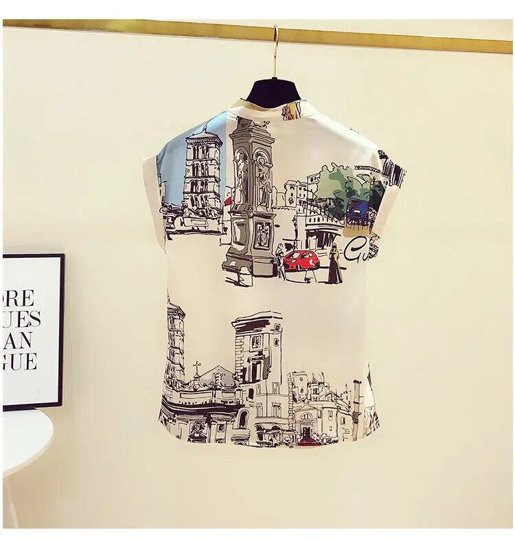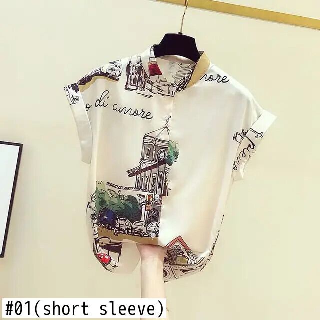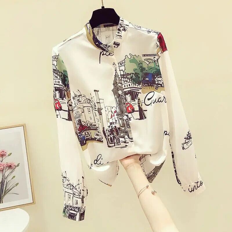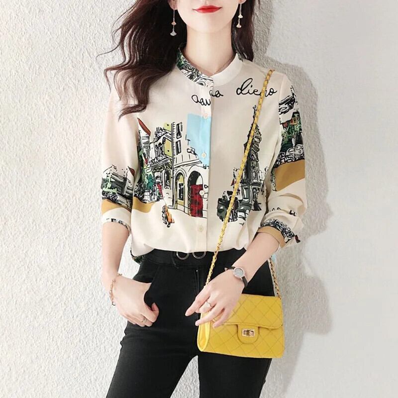 送料無料 ヴィンテージプリントスプライス O ネック特大シフォンシャツ夏と秋トップスルーズ通勤女性のブラウス サマー 夏物 オータム 秋物 Oネック ビンテージ AE1288776687741357376