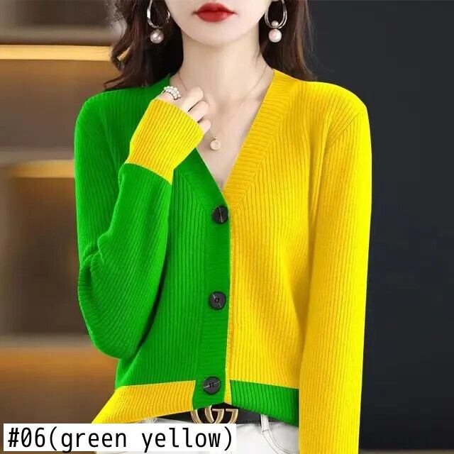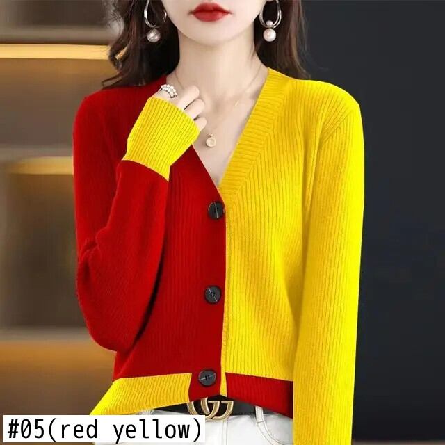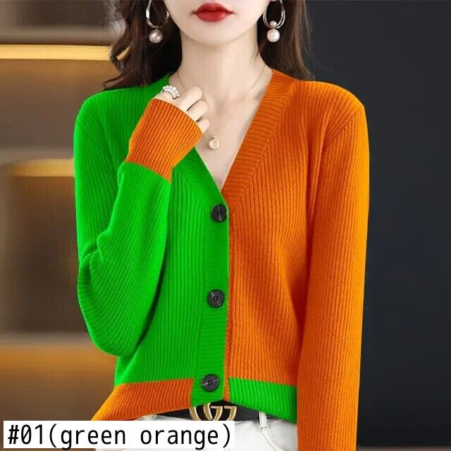 送料無料 Vネックスプライスカラーニットカーディガンセーターレディース2022秋ルーズトップスオールマッチコート オータム 秋物 AE1288776641555318787