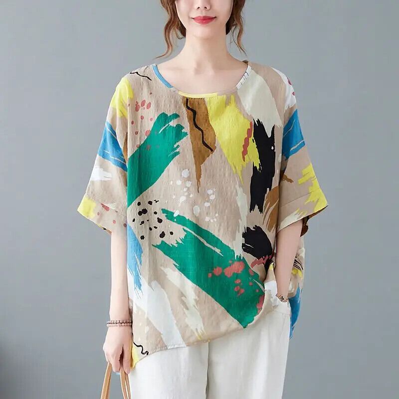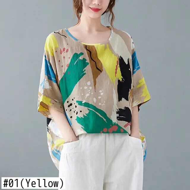 送料無料 O ネックバットウィングスリーブプリントブラウス女性の 2024 夏ルーズプルオーバーオールマッチ通勤シャツ サマー 夏物 Oネック AE1288776613530095771
