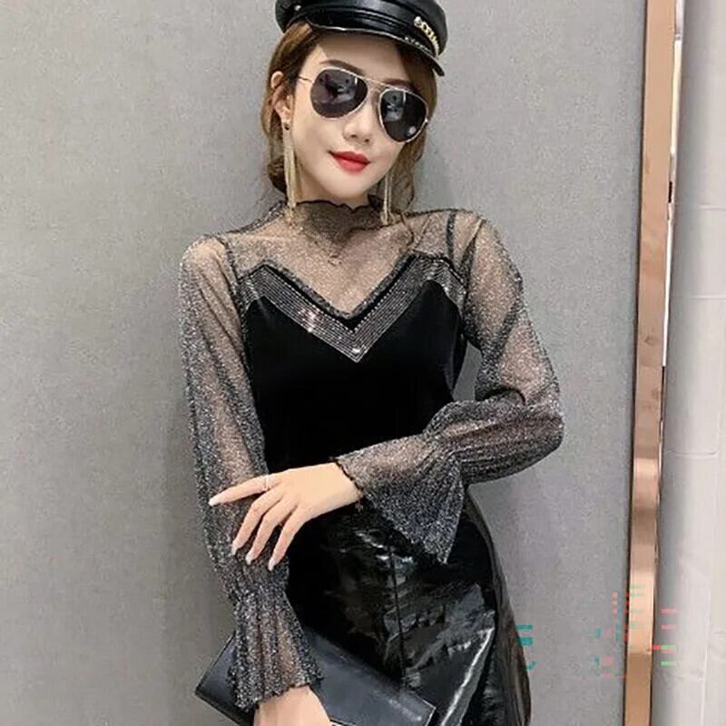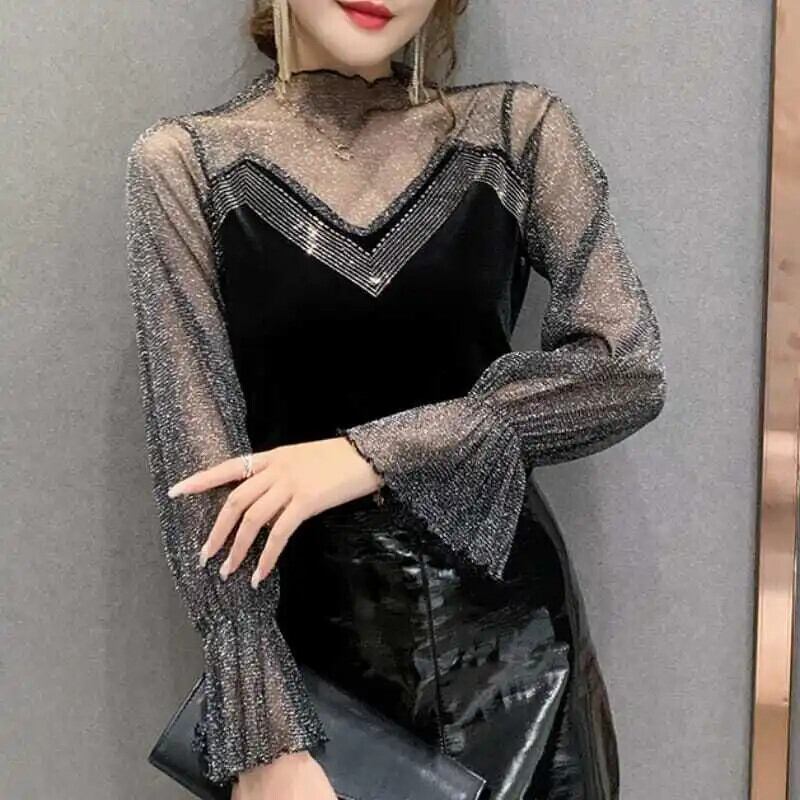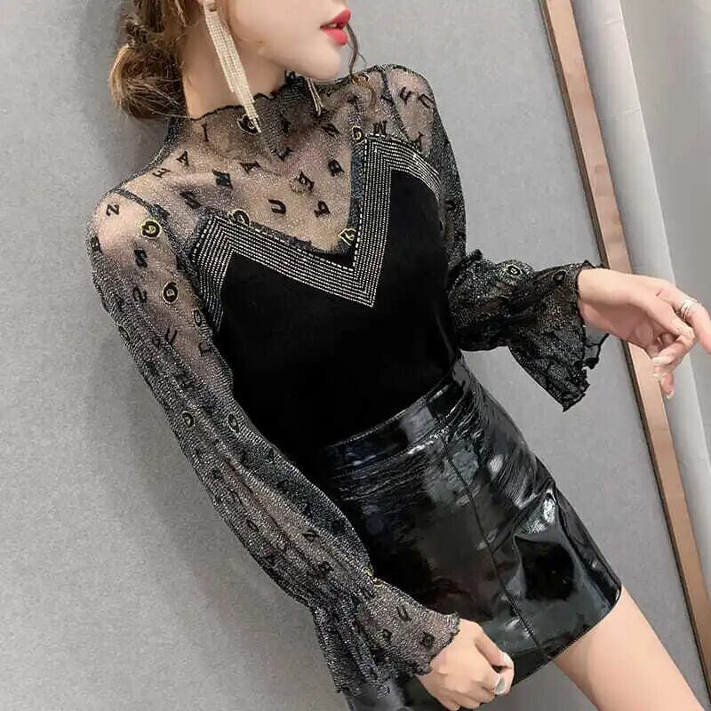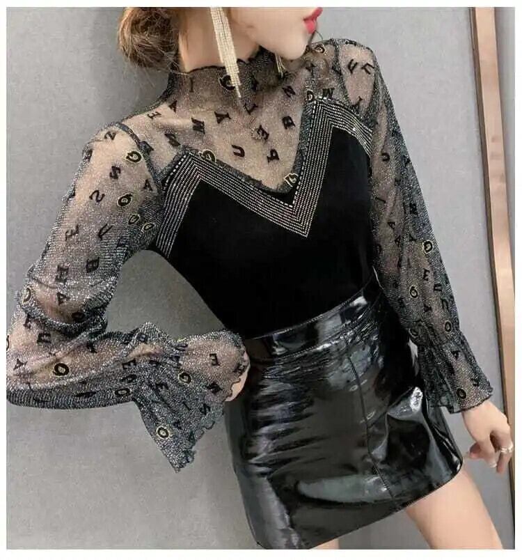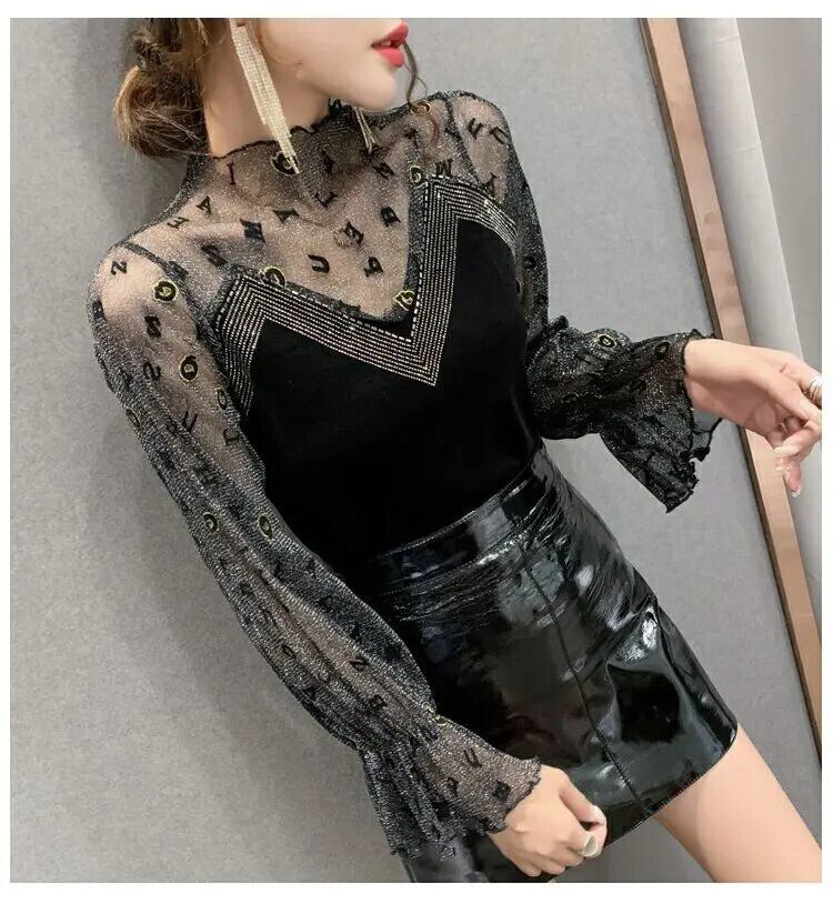 送料無料 スタイリッシュなプリントスプライスレターガーゼダイヤモンドブラウス女性の 2022 秋プルオーバーフレアスリーブシックなシャツ オータム 秋物 AE1288776651519193471
