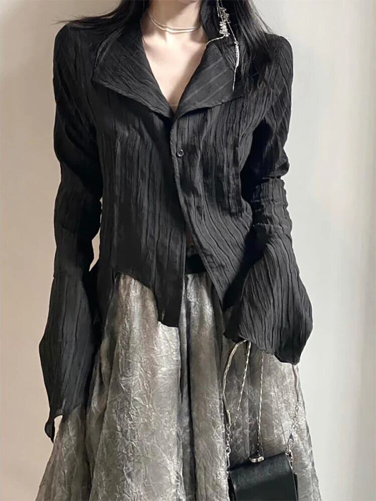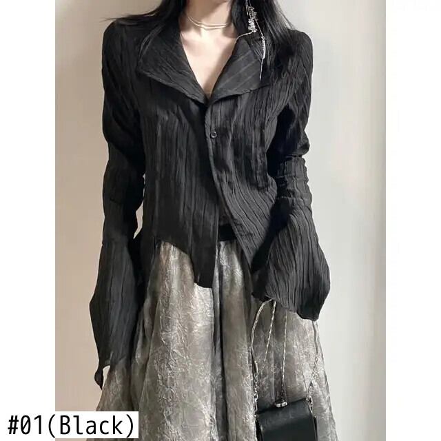送料無料 ラペルソリッドカラーひだ不規則なシャツ女性の 2023 秋冬ルーズトップスフレアスリーブブラウス オータム 秋物 ウィンター 冬物 AE128877661342907898