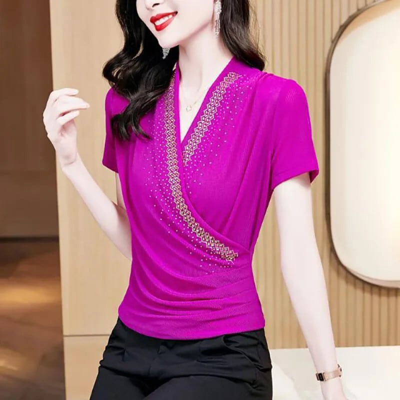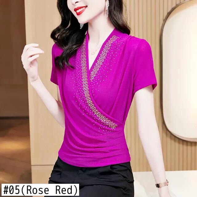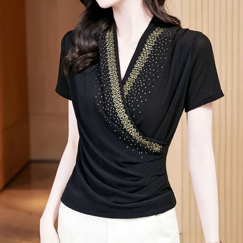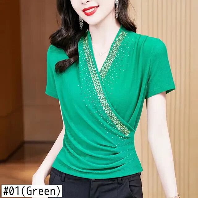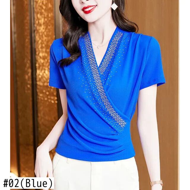 送料無料 V ネック折り目ガーゼダイヤモンドブラウス女性の 2023 夏特大プルオーバールーズオフィスレディシャツ サマー 夏物 Vネック 会社 学校 通勤や通学にも AE1288776623077085530