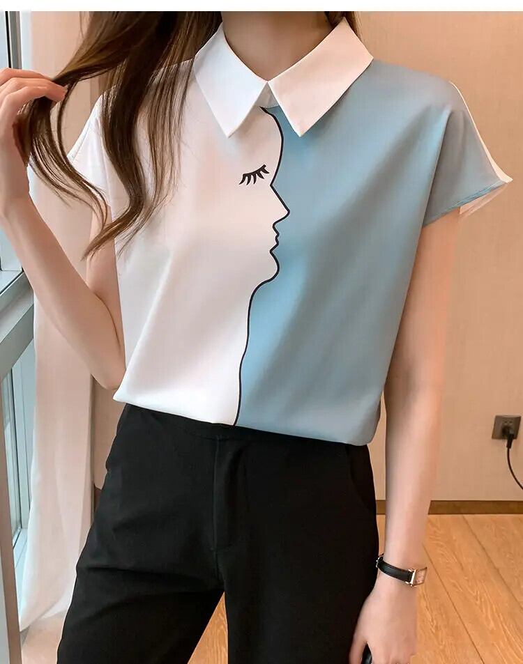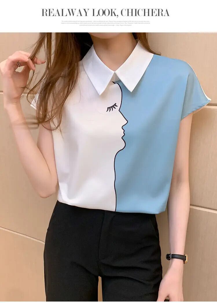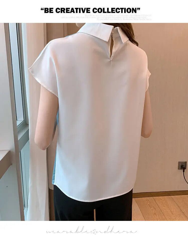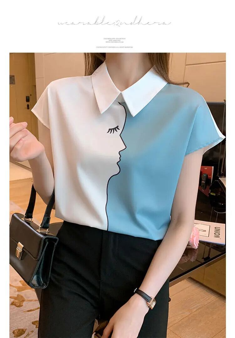 送料無料 ラペルカラーマッチング夏半袖シフォンシャツ女性ブラウスプリントオールマッチオフィスレディプルオーバートップス ショート ハーフスリーブ サマー 夏物 会社 学校 通勤や通学にも AE1288776682636412126