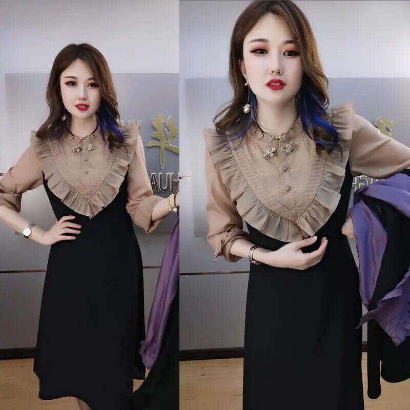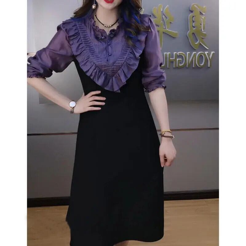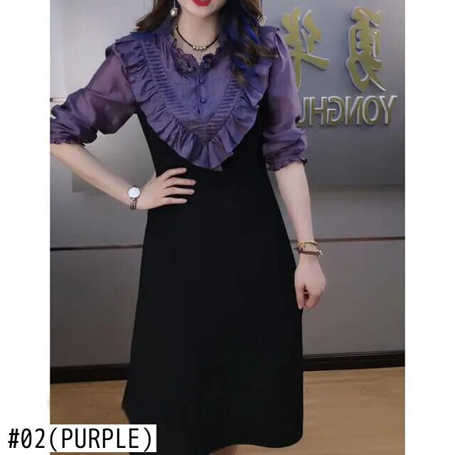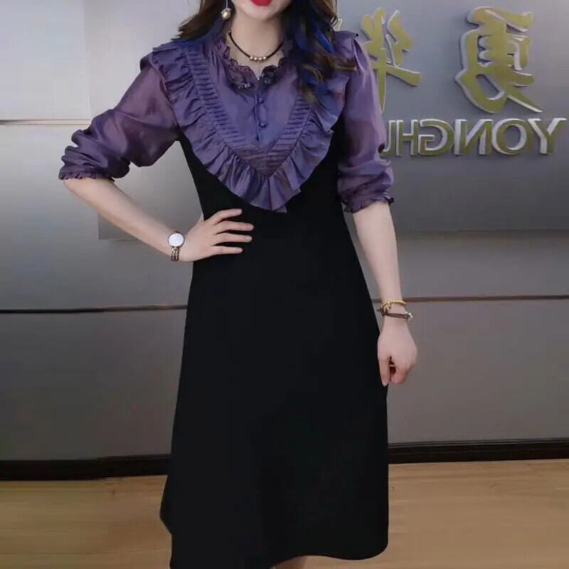 送料無料 フリルネックスプライシングフリルフェイクツーピースミディドレスレディース 2024 春ルーズオールマッチドレス ラッフル スプリング 春物 AE1288776636737279026