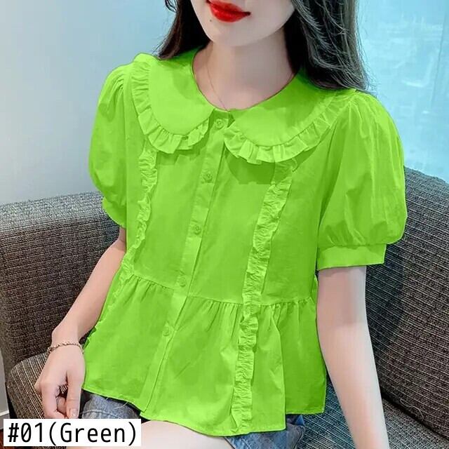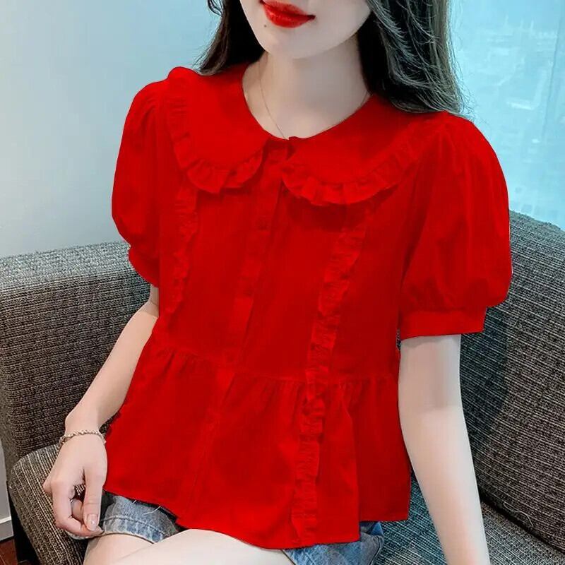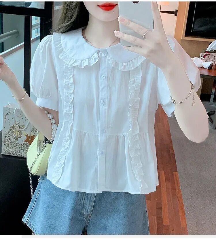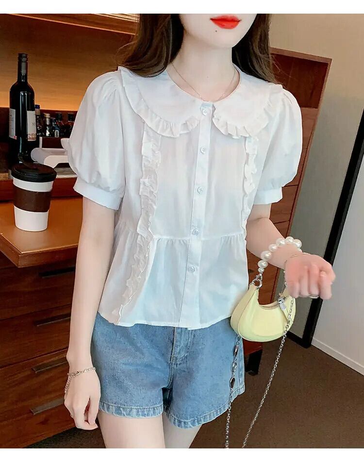 送料無料 甘いピーターパン襟折りフリルパフスリーブシャツ女性の 2023 夏オーバーサイズトップスオールマッチブラウス ラッフル 大人ガーリー スウィート キュート カジュアル サマー 夏物 AE1288776685366259541