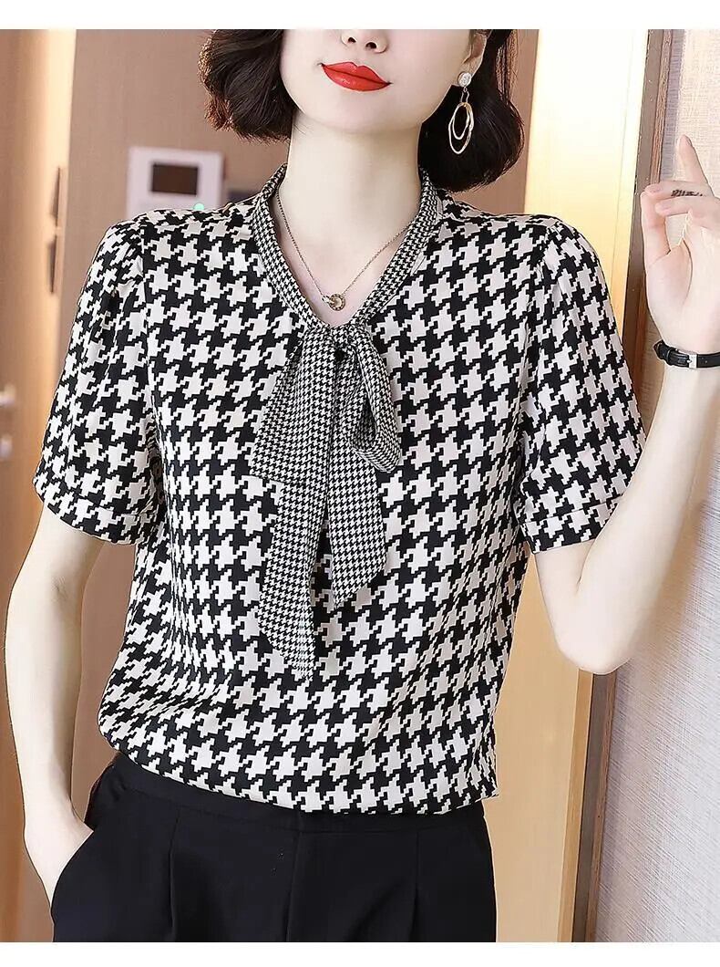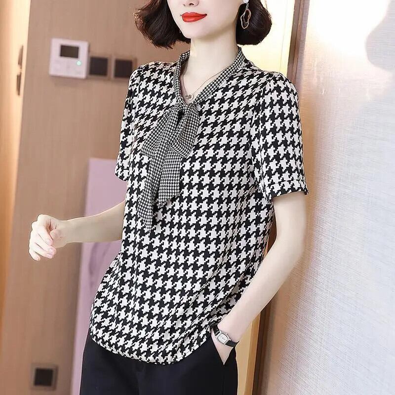 送料無料 プリント千鳥格子スプライスリボンルーズシフォンシャツサマープルオーバー特大通勤女性のブラウス 夏物 AE1288776675191655982