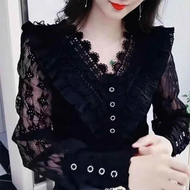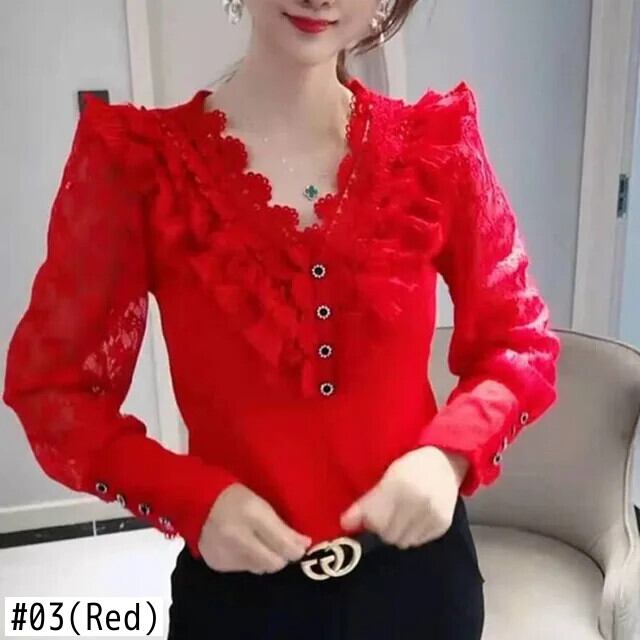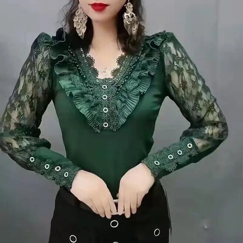 送料無料 V ネックレーススプライシングビーズフリルブラウス女性 2023 秋冬ルーズ通勤プルオーバーオフィスレディシャツ ラッフル オータム 秋物 ウィンター 冬物 Vネック 会社 学校 通勤や通学にも AE1288776648232989262