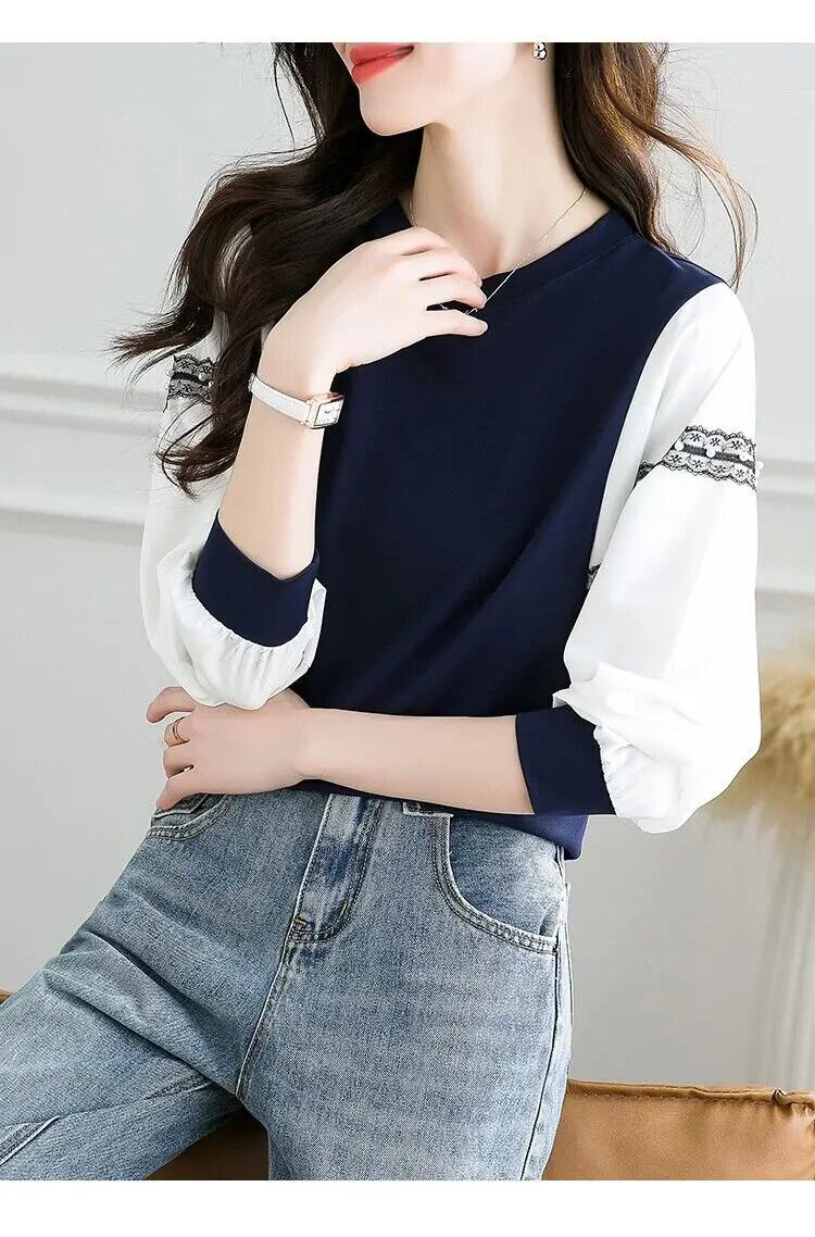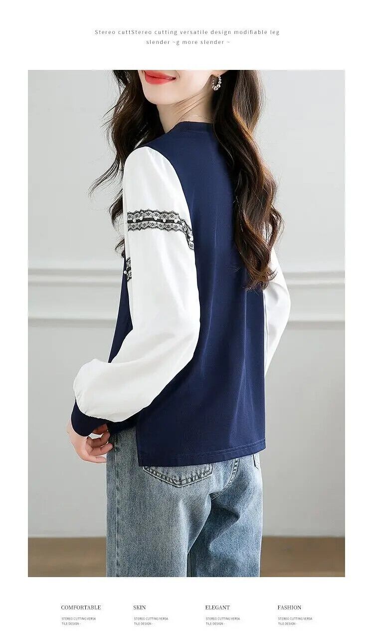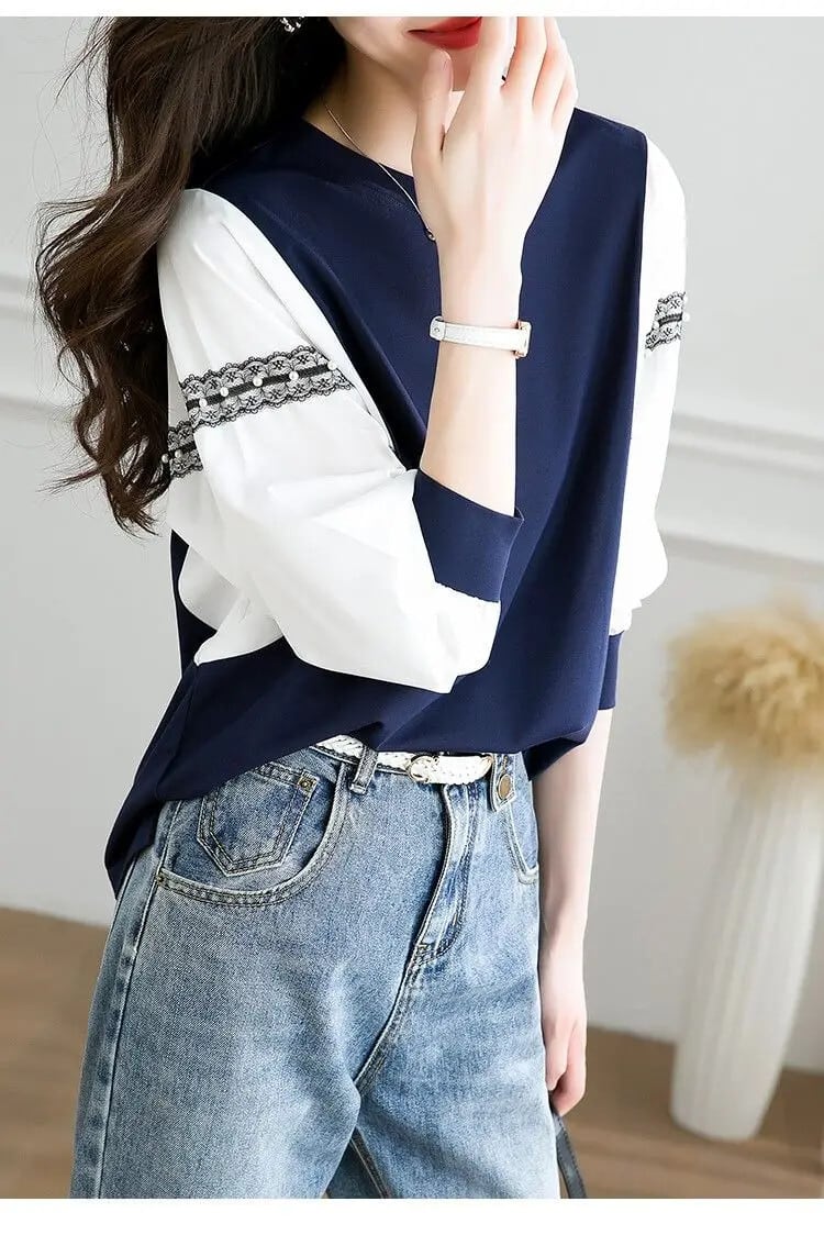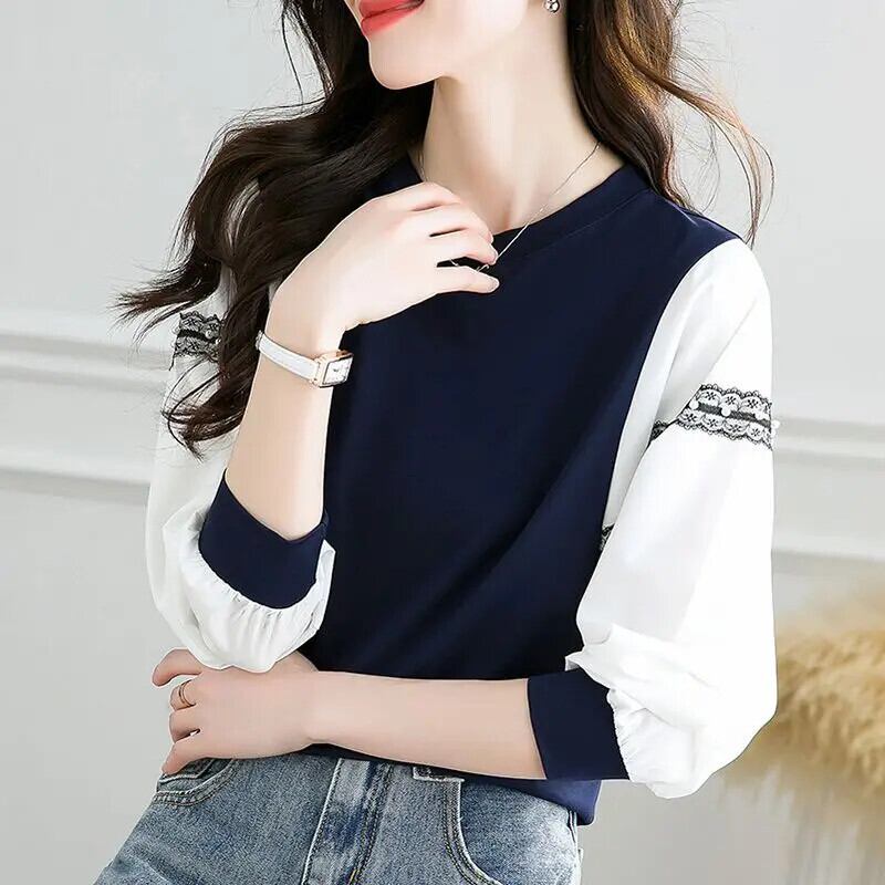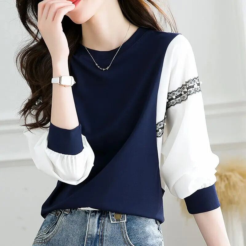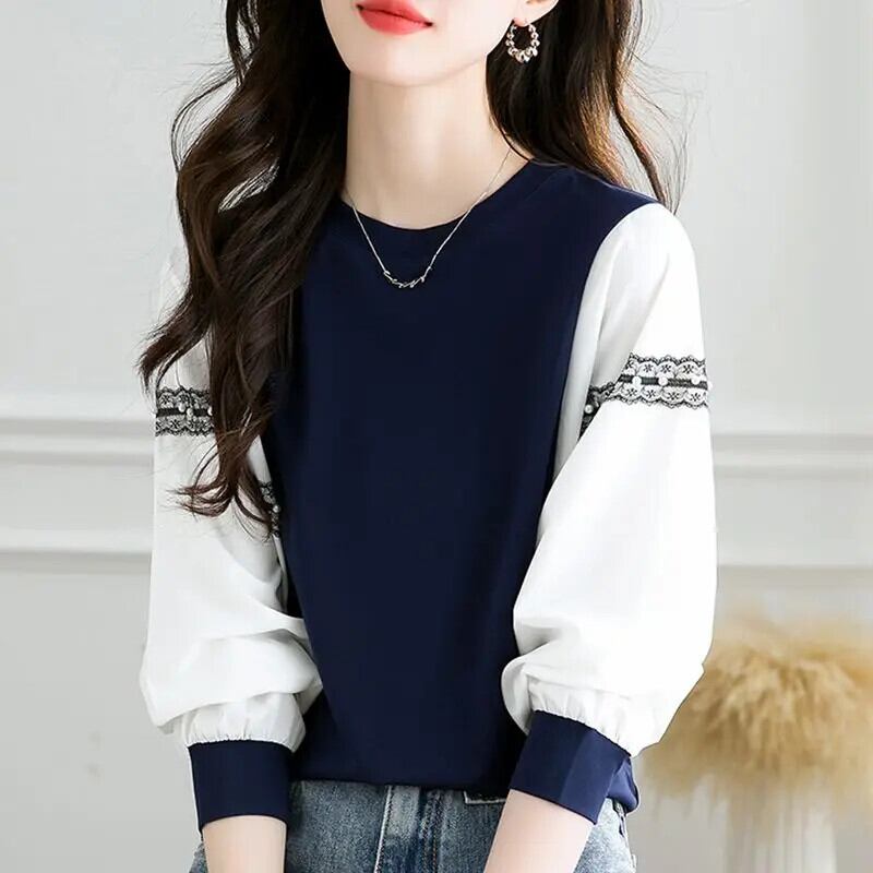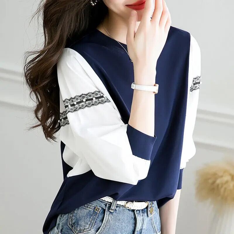 送料無料 O ネックレースビーズフェイクツーピースブラウス女性 2024 春ルーズオールマッチプルオーバートップスシャツ スプリング 春物 Oネック AE1288776699543409485