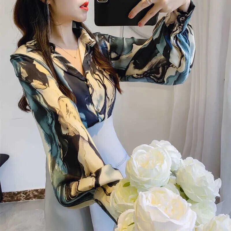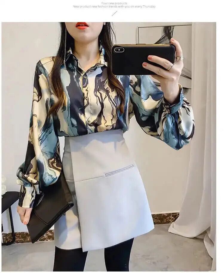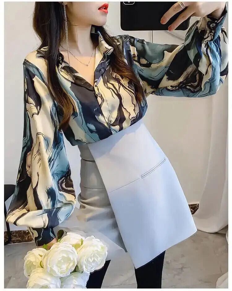 送料無料 ランタンスリーブプリントラペルボタンシャツルーズ通勤トップス春秋特大女性ブラウス スプリング 春物 オータム 秋物 AE1288776694454055763