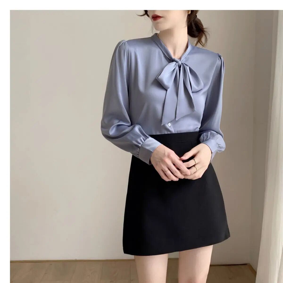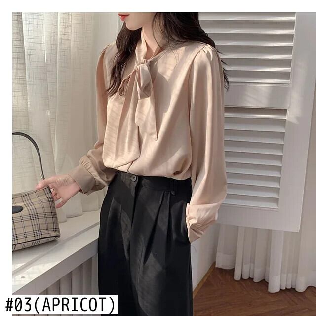 送料無料 V ネック弓長袖ルーズサテンブラウスプラスサイズ春秋ソリッドカラートップス通勤女性シャツ ロング リボン 大きめサイズ スプリング 春物 オータム 秋物 Vネック AE1288776668768352418