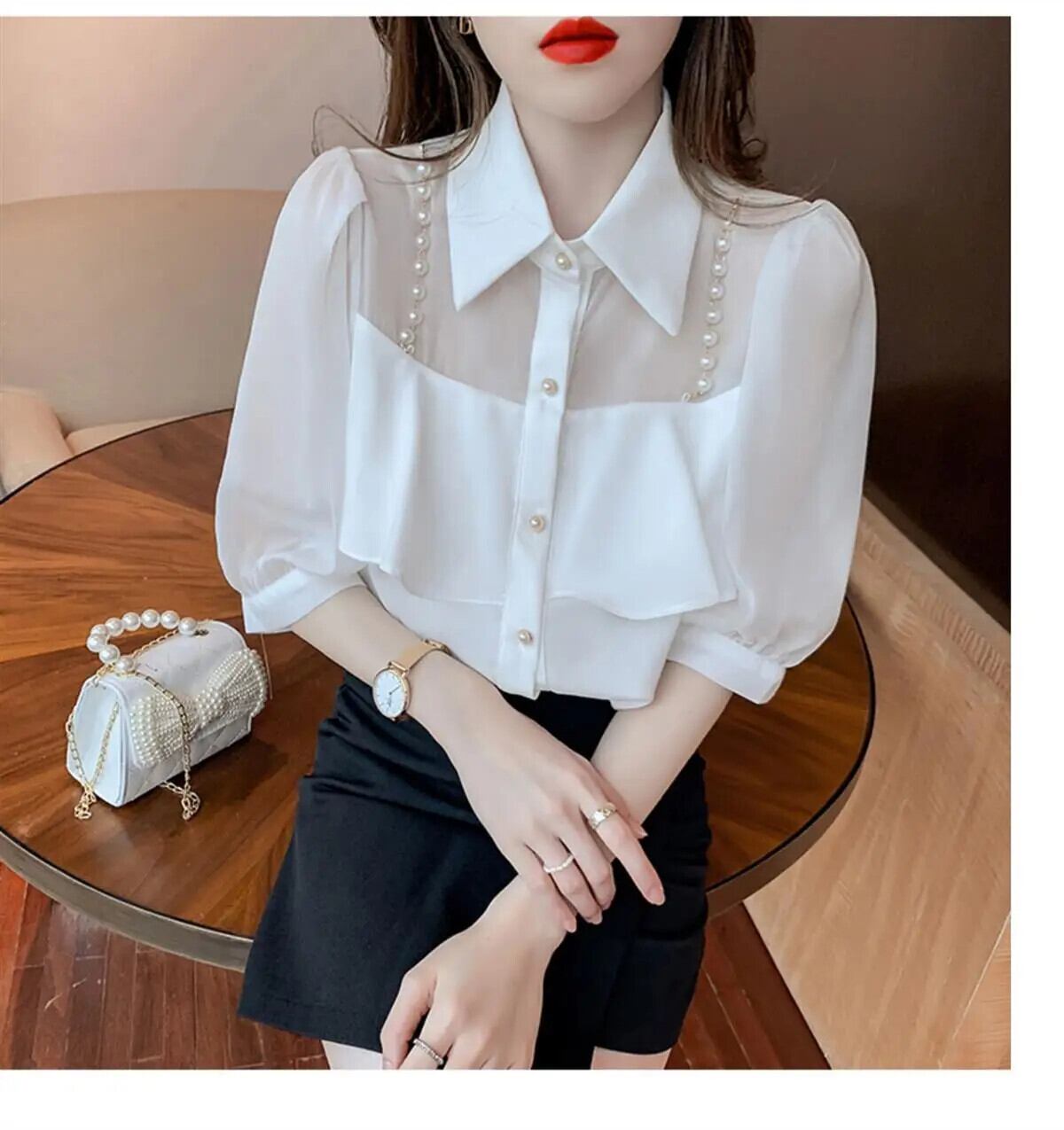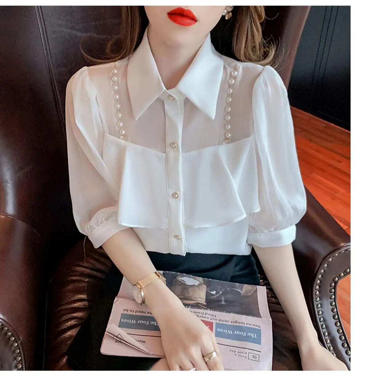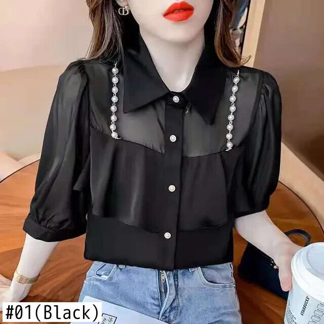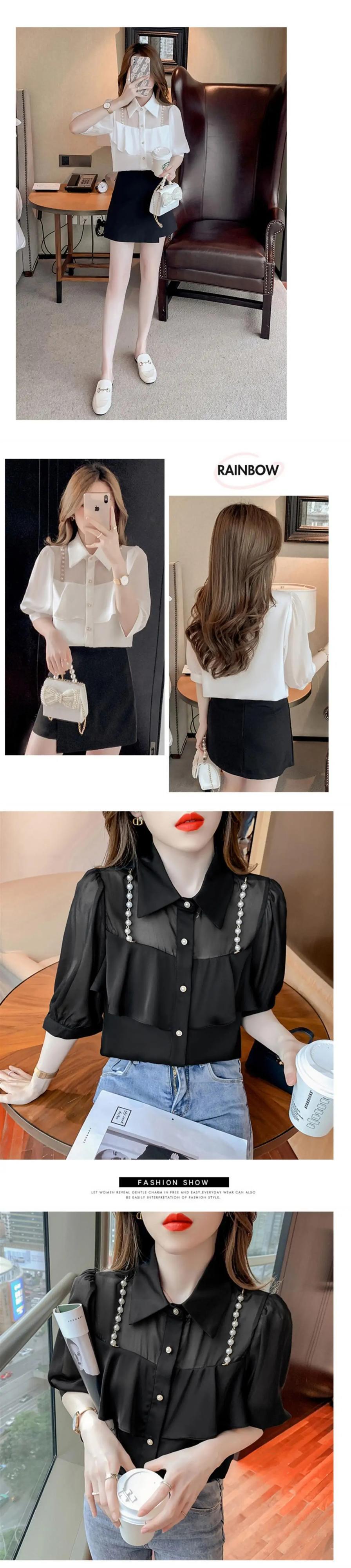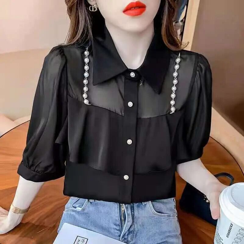 送料無料 甘いラペルビーズスプライスボタンシフォンブラウス夏プラスサイズルーズトップス半袖通勤シャツ ショート ハーフスリーブ 大きめサイズ 大人ガーリー スウィート キュート カジュアル サマー 夏物 AE1288776642810961974