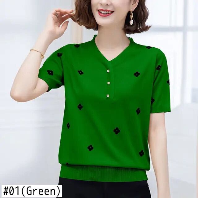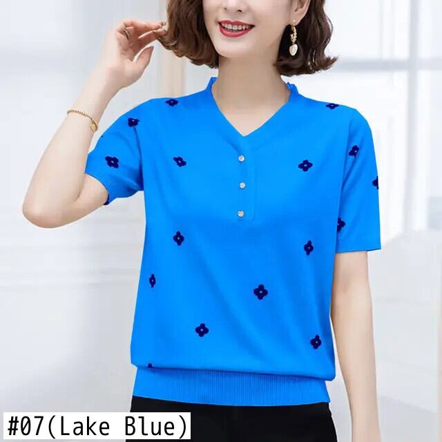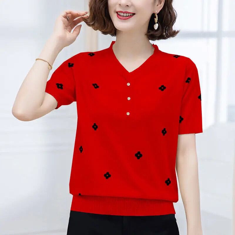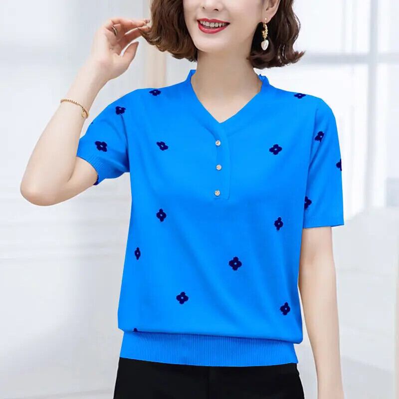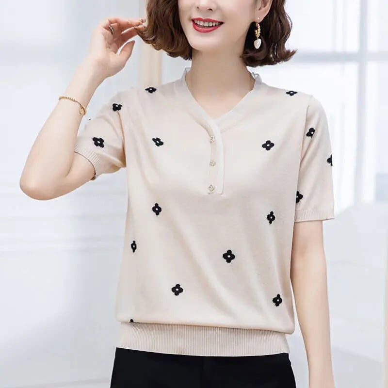 送料無料 V ネックスプライスボタンルーズ刺繍ブラウス女性の 2023 夏特大プルオーバー通勤シャツ サマー 夏物 Vネック AE1288776623804154746