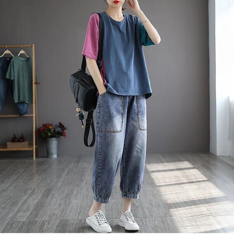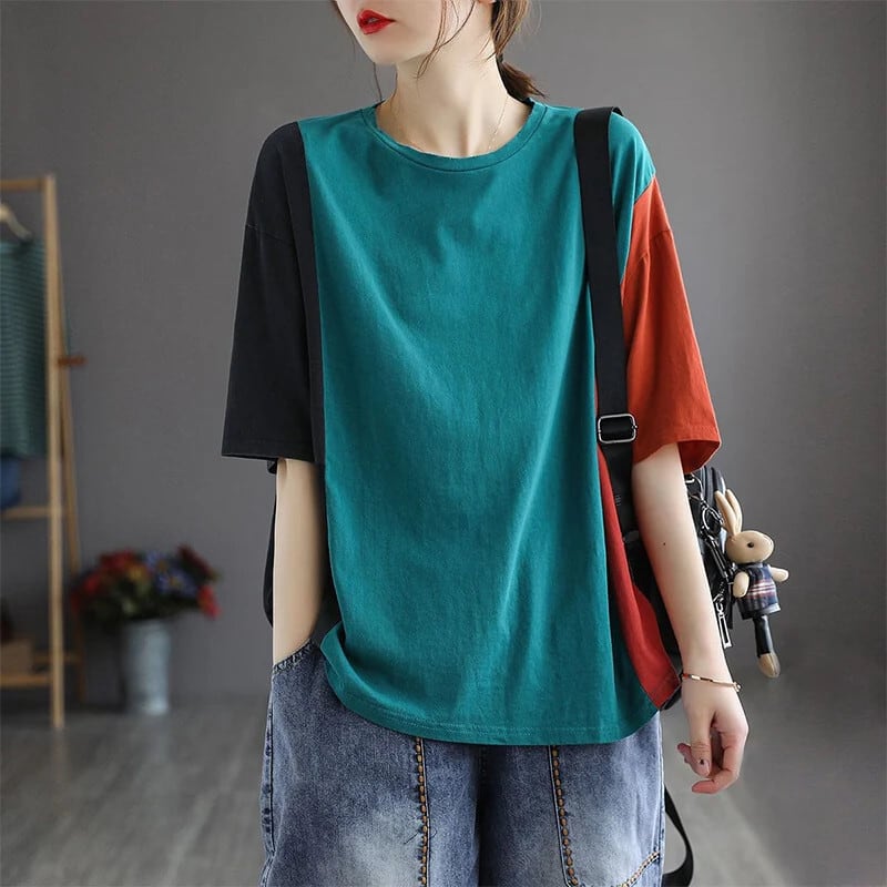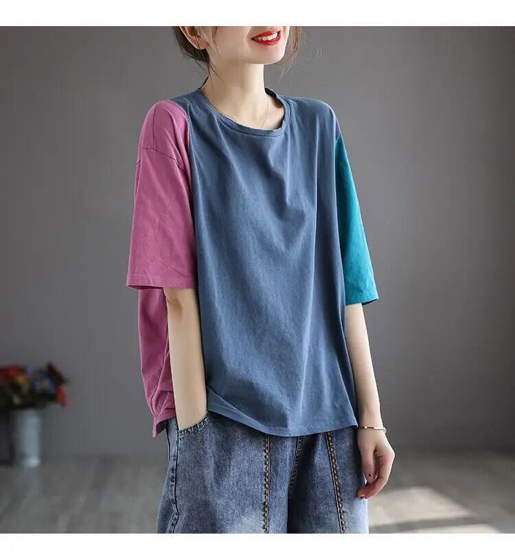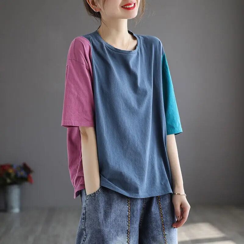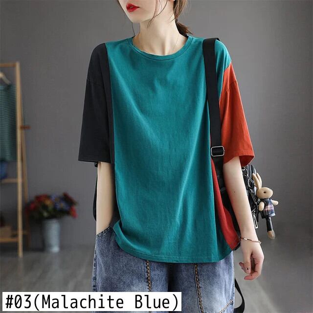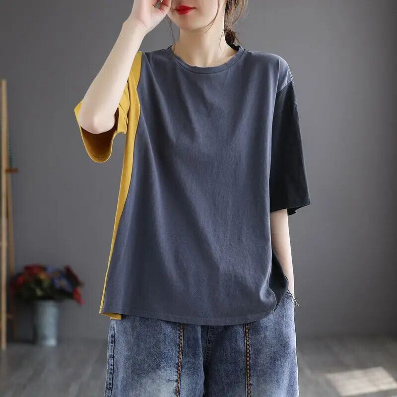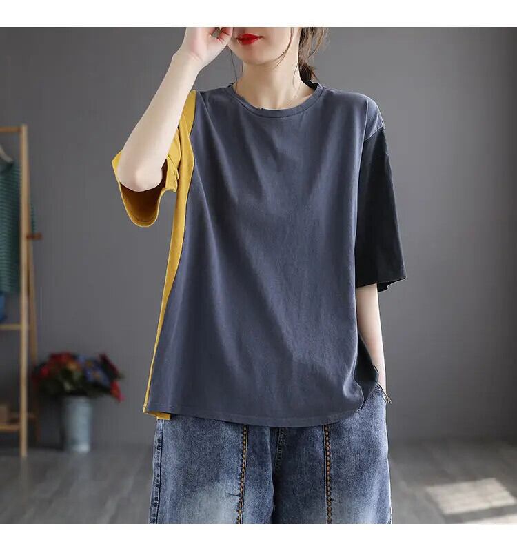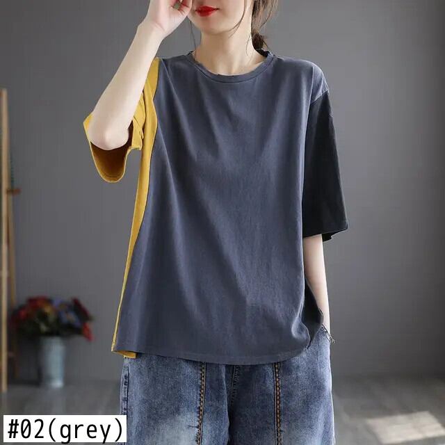送料無料 O ネックスプライシングルーズカラー非対称 Tシャツ女性 2024 夏ルーズオールマッチトップス Tシャツ サマー 夏物 Oネック AE1288776633568650137