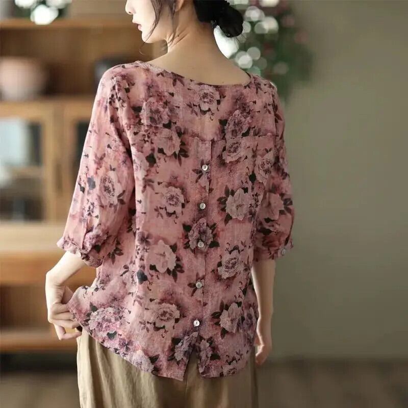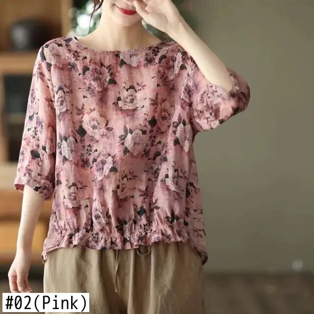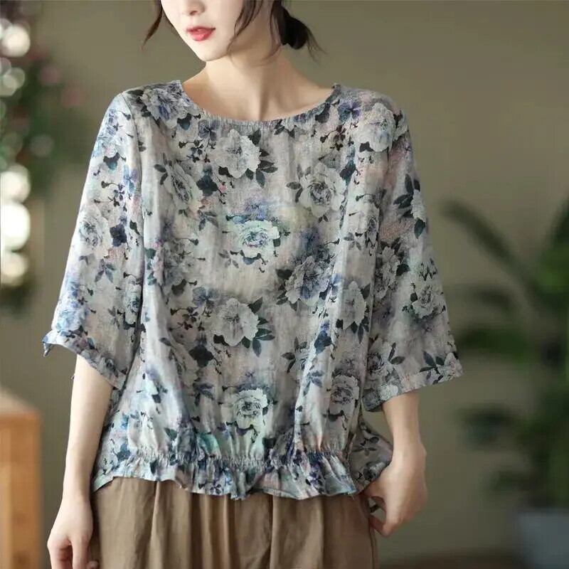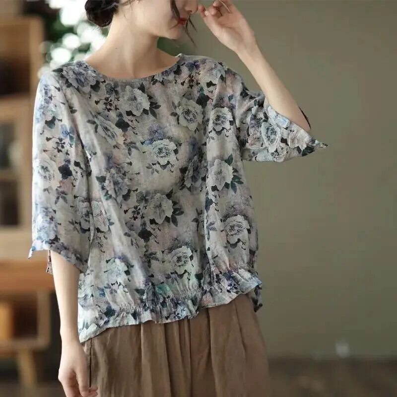 送料無料 ヴィンテージプリント O ネックルーズシャーリングひだブラウス女性の 2023 夏プルオーバー半袖シャツ ハーフスリーブ サマー 夏物 Oネック ビンテージ AE1288776659865873718