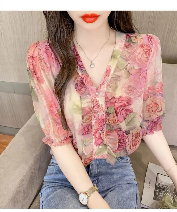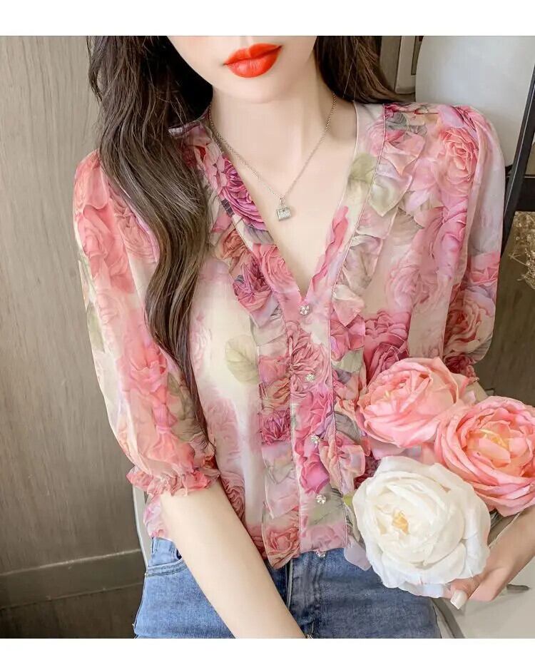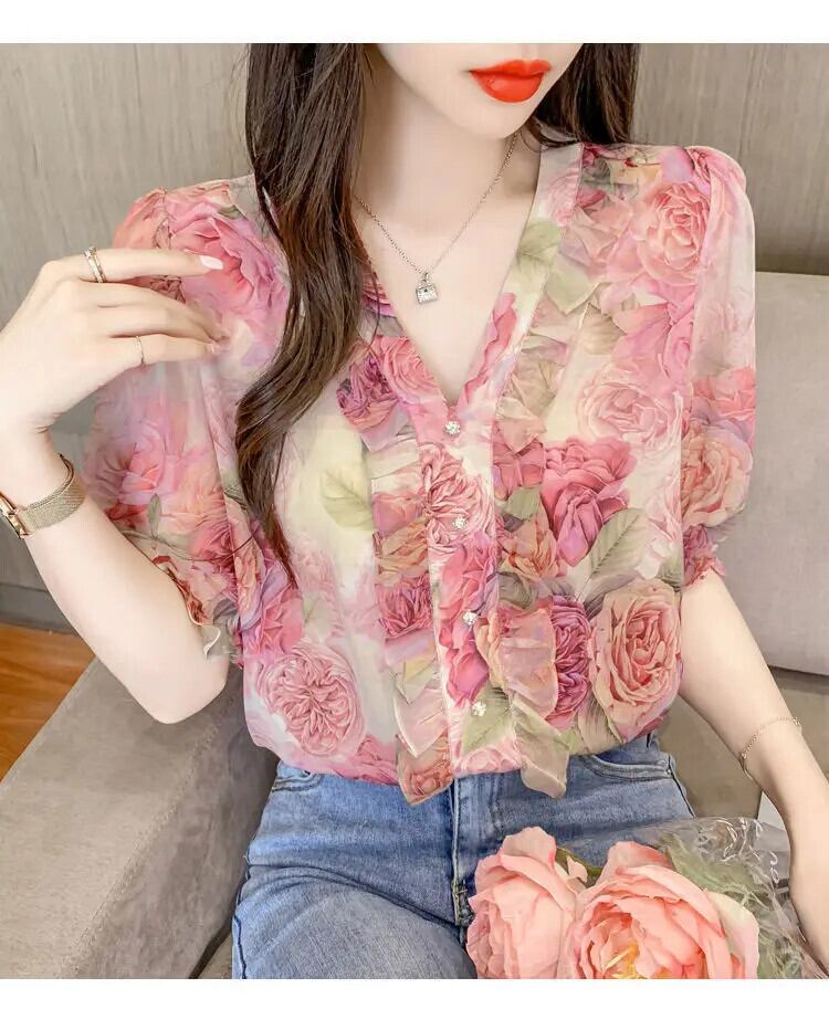 送料無料 ヴィンテージプリント V ネックスプライシングフリル花柄ブラウス女性の 2023 夏プルオーバースリーブシャツ ラッフル サマー 夏物 Vネック ビンテージ AE1288776635609890385