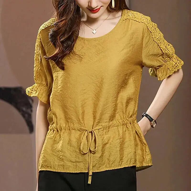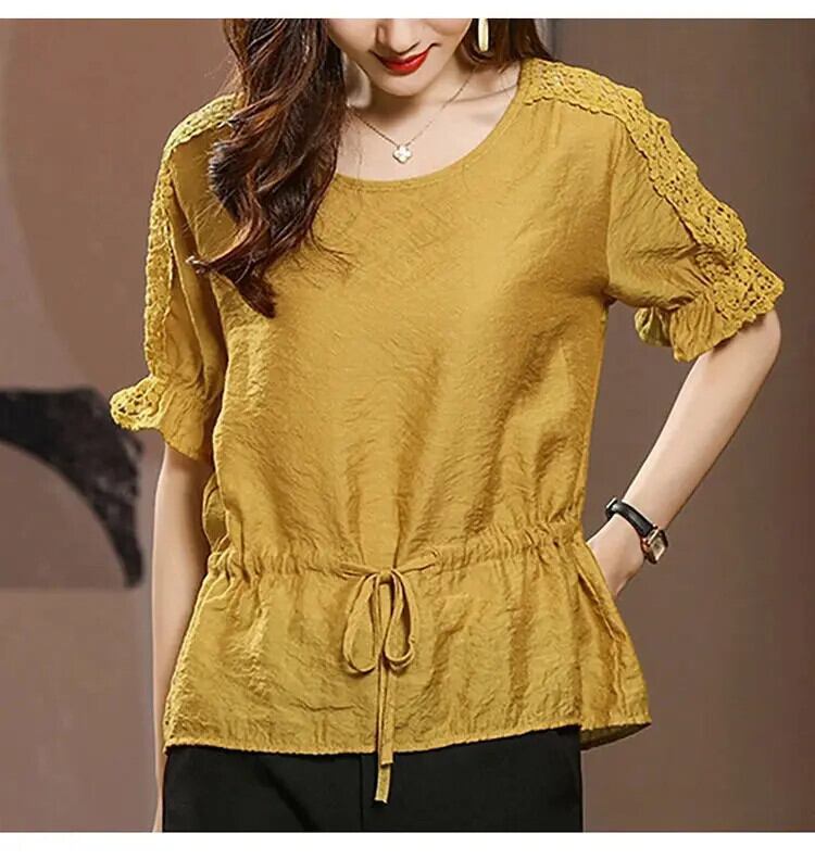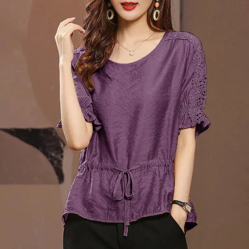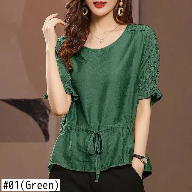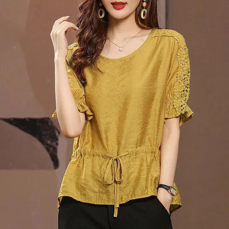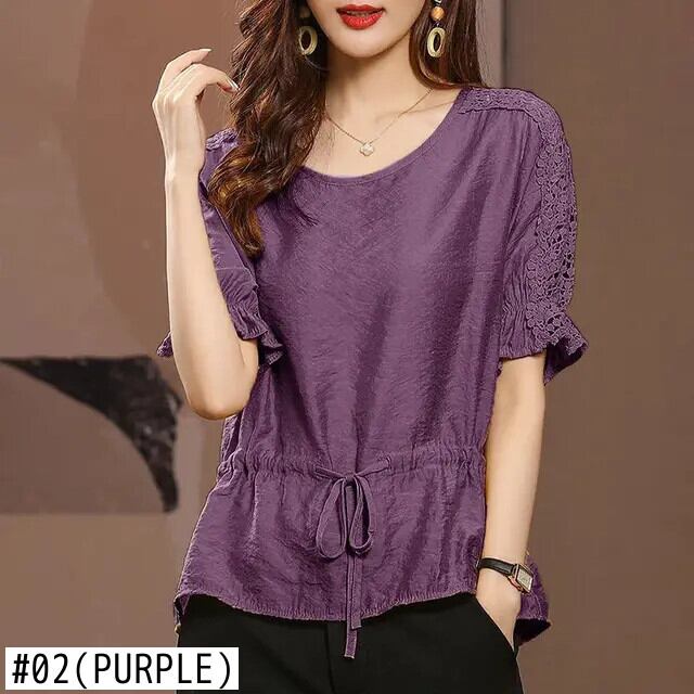 送料無料 レース中空アウトスプライス O ネック包帯フレアスリーブルーズブラウス夏の女性のプラスサイズの通勤シャツ 大きめサイズ サマー 夏物 Oネック AE1288776651800586938