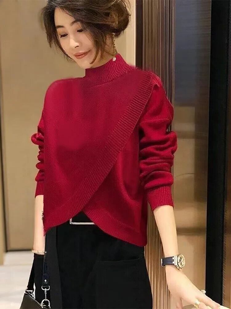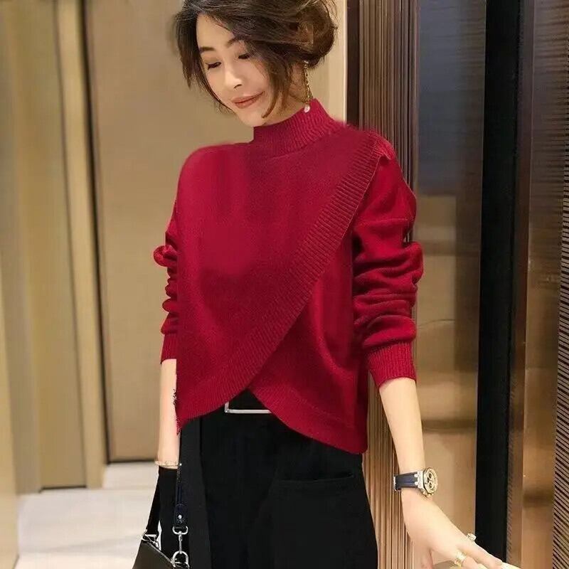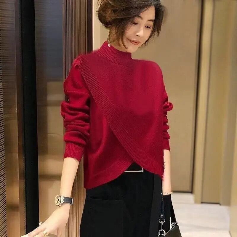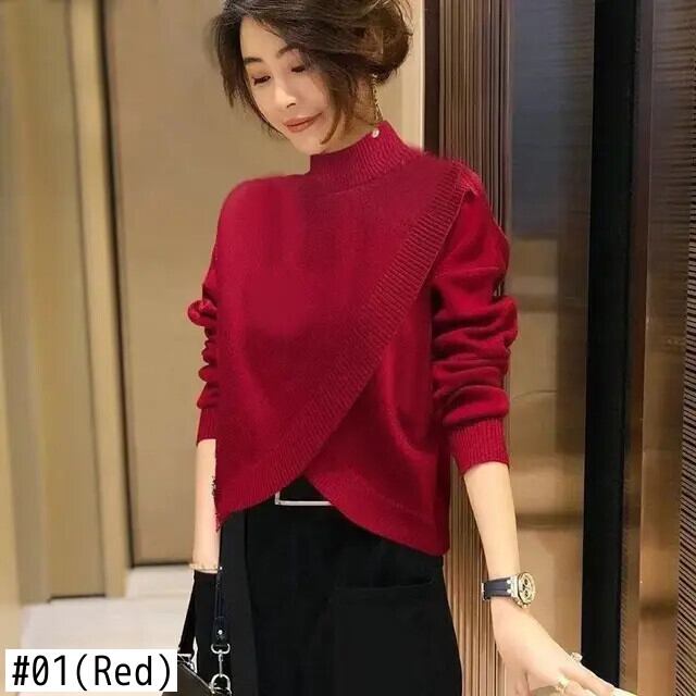 送料無料 ソリッドカラーニットスプライシング非対称セーター女性の2022秋ルーズプルオーバー不規則なトップス オータム 秋物 AE1288776638760540789