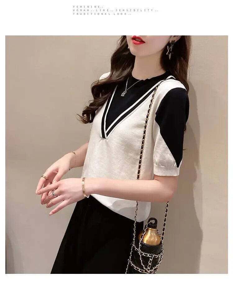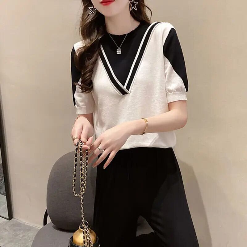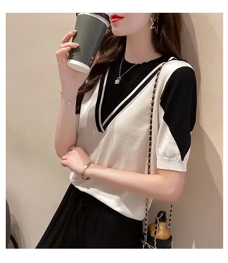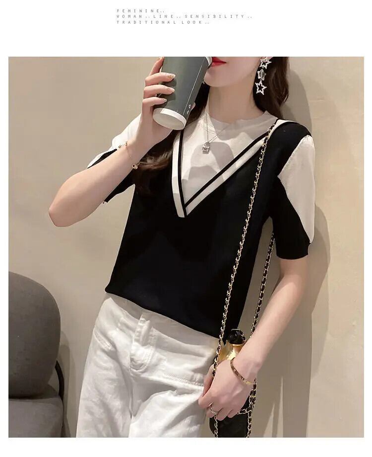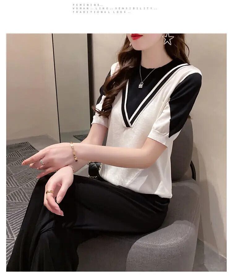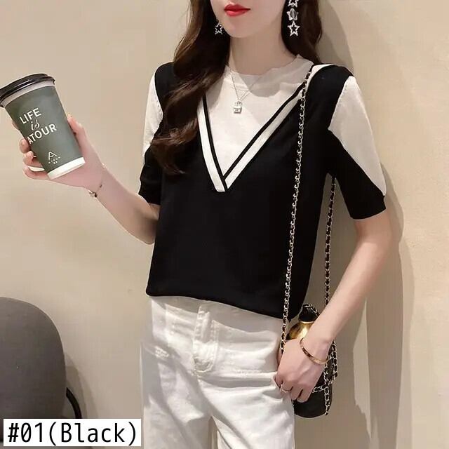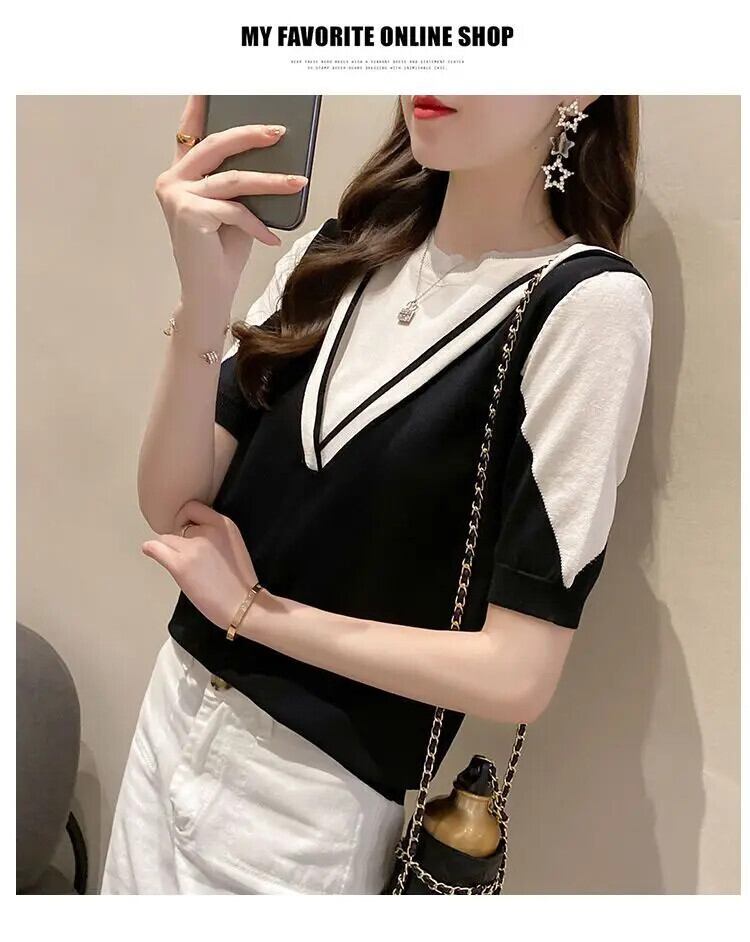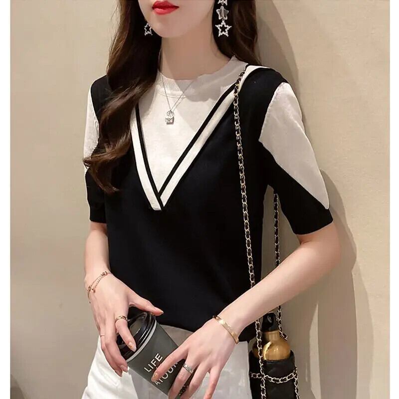 送料無料 O ネックスプライスフェイクツーピースブラウス女性の 2023 夏ルーズプルオーバー半袖シャツ ショート ハーフスリーブ サマー 夏物 Oネック AE1288776624350128418