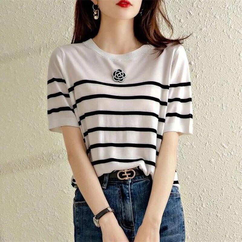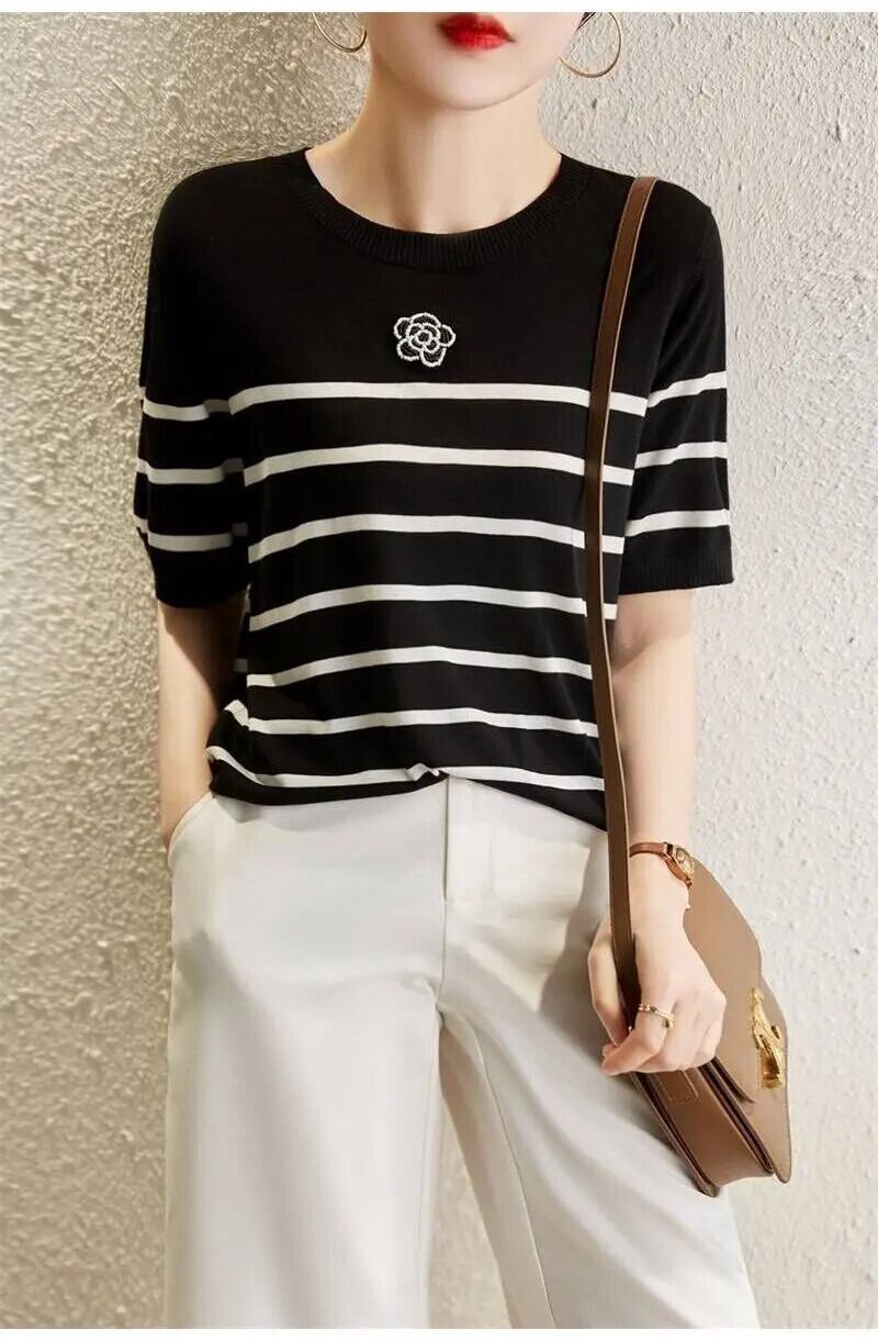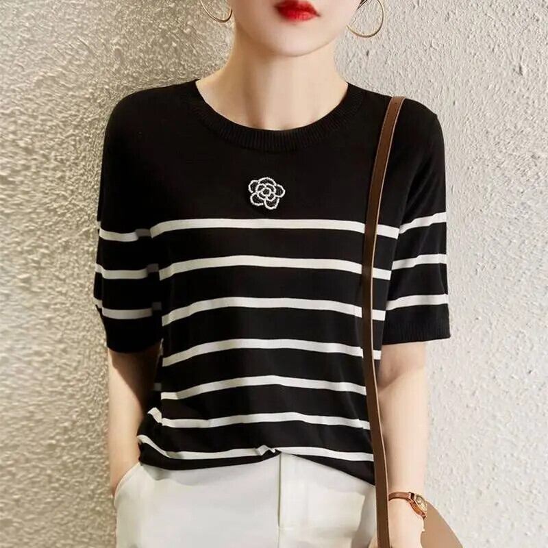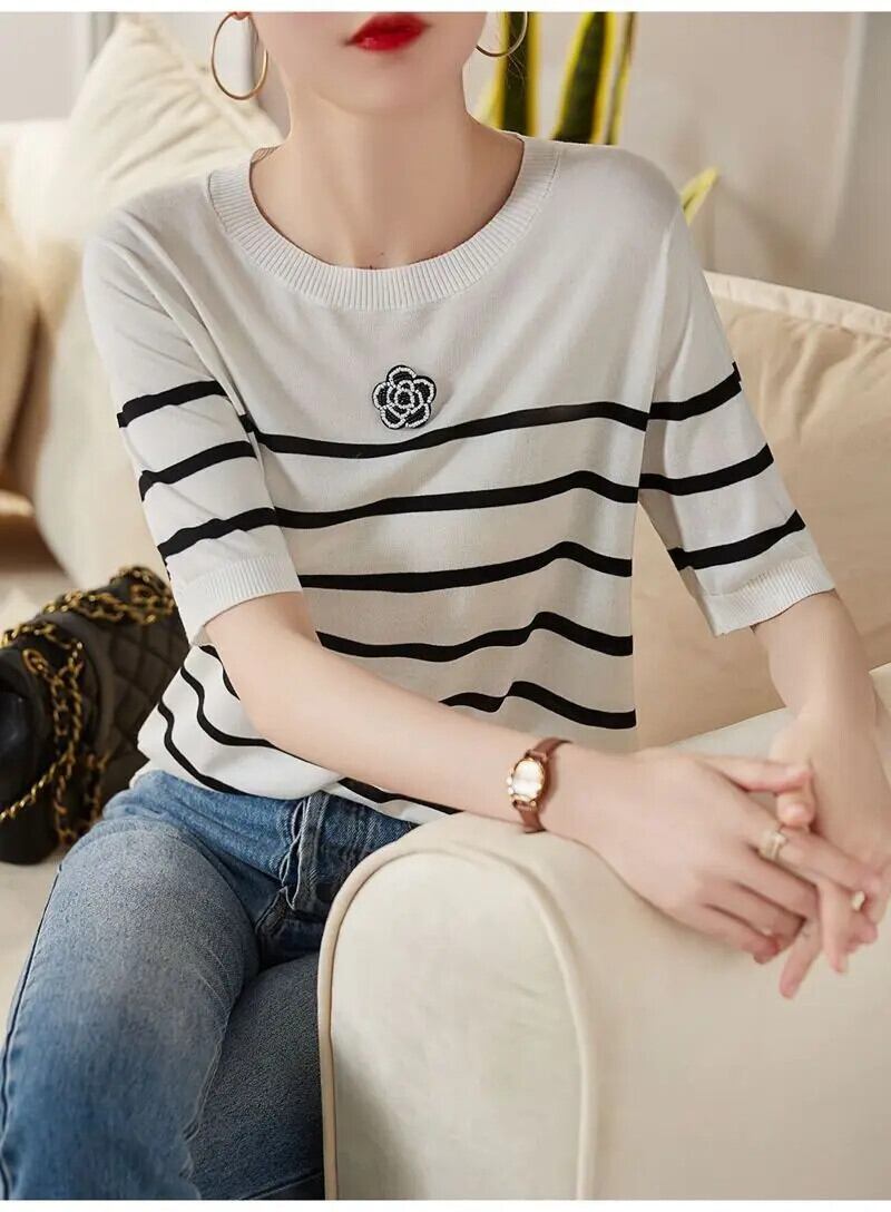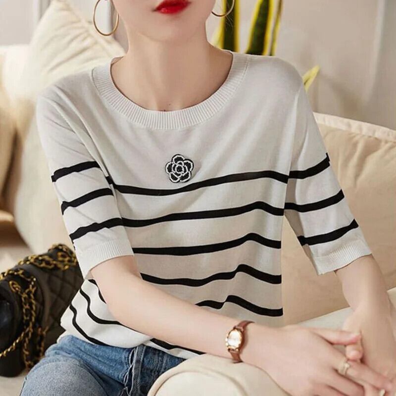送料無料 O ネック ニット スプライス ビーズ ストライプ ブラウス レディース 2023 春プルオーバー オールマッチ シャツ スプリング 春物 Oネック AE1288776696876222124