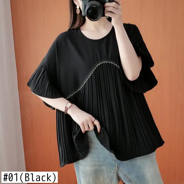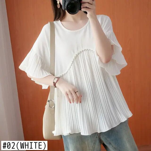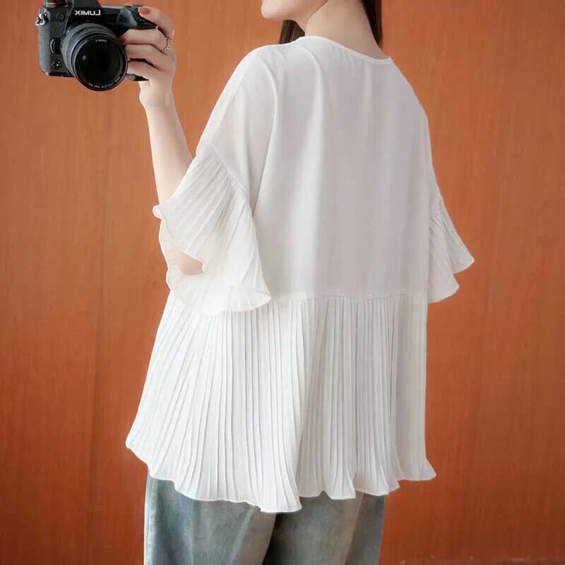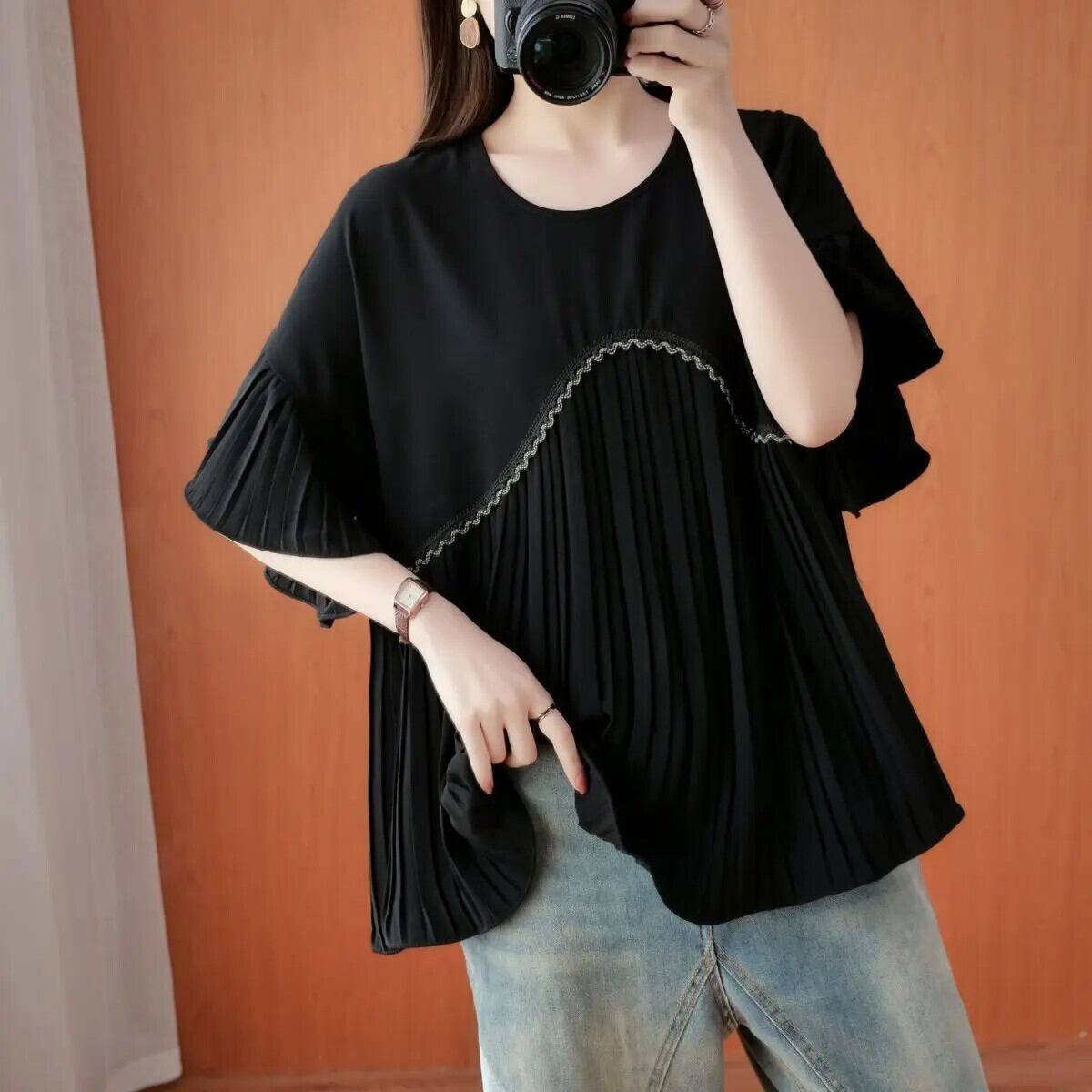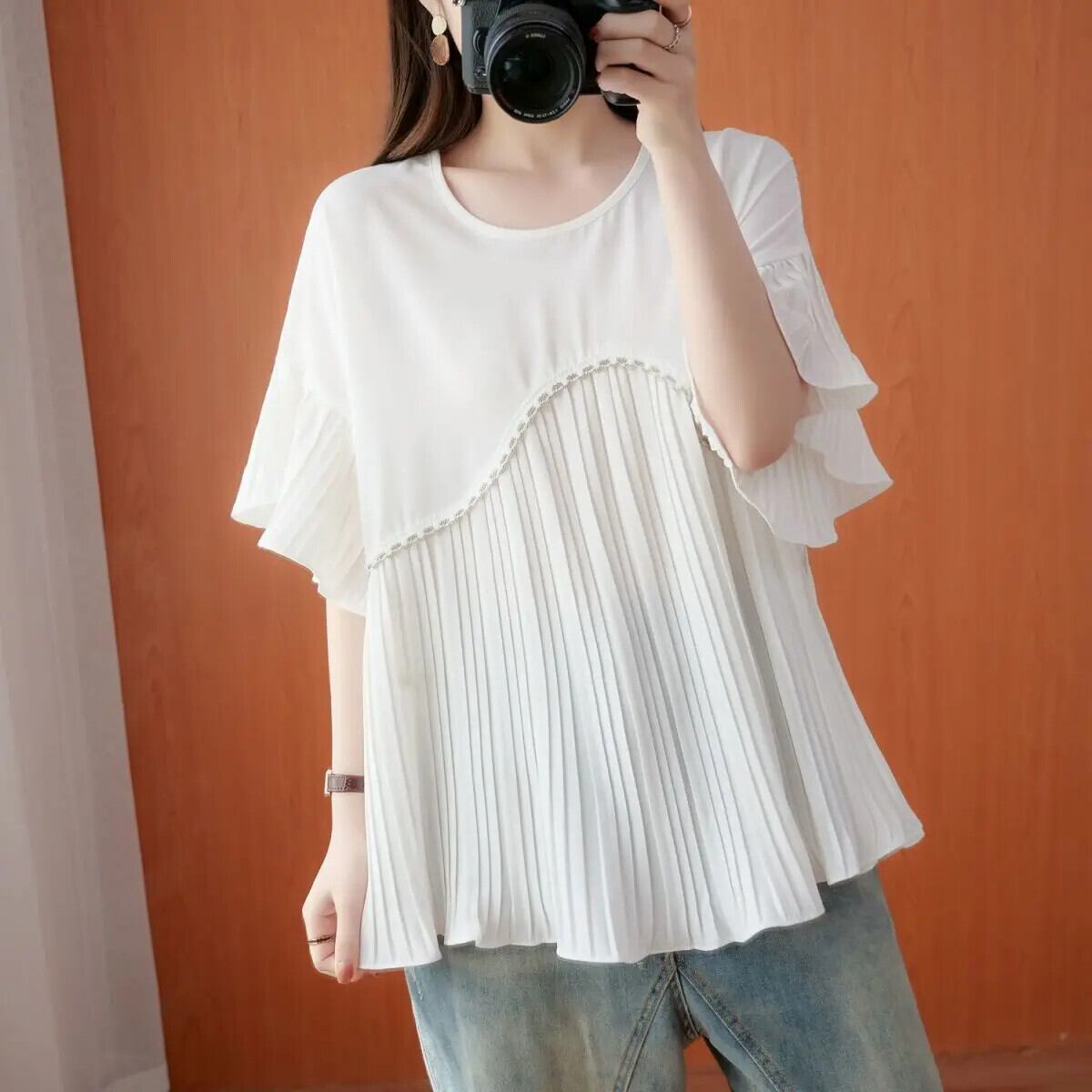 送料無料 O ネックルーズひだバタフライスリーブブラウス女性の 2024 夏特大トップスオフィスレディシャツ サマー 夏物 Oネック 会社 学校 通勤や通学にも AE1288776634329679744