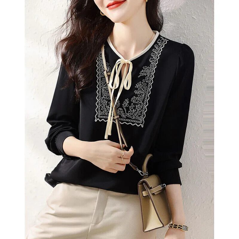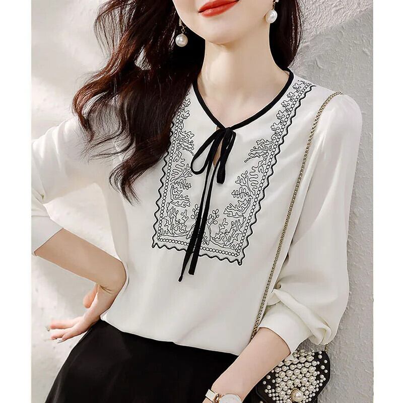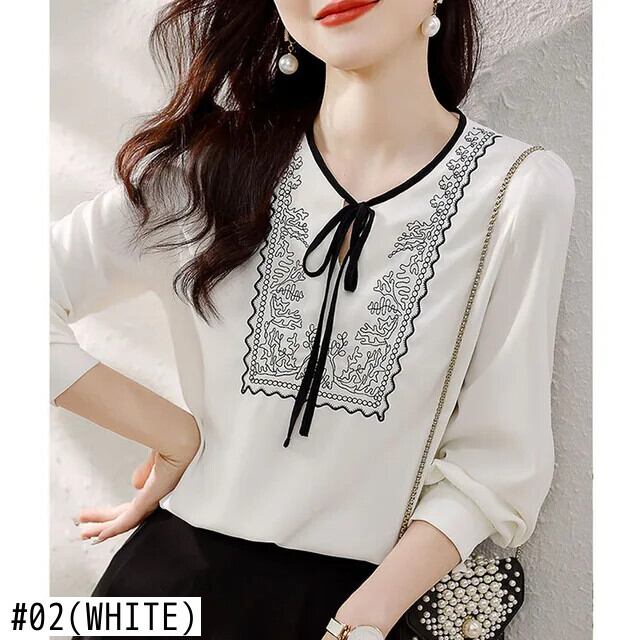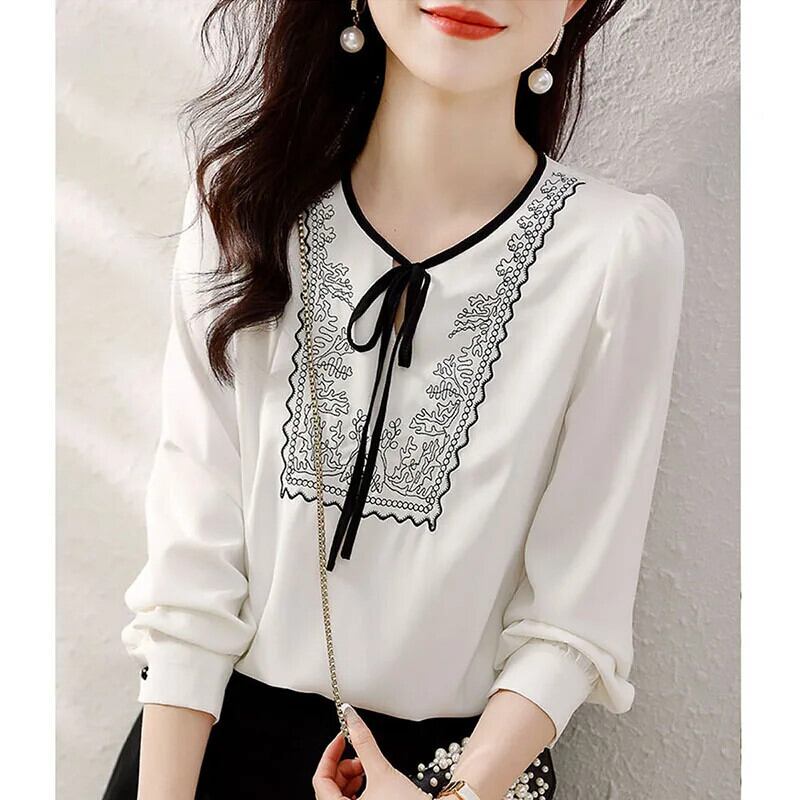 送料無料 中空刺繍レースアップボウブラウス女性の 2023 秋冬特大トップス通勤シャツ リボン オータム 秋物 ウィンター 冬物 AE1288776688375791217