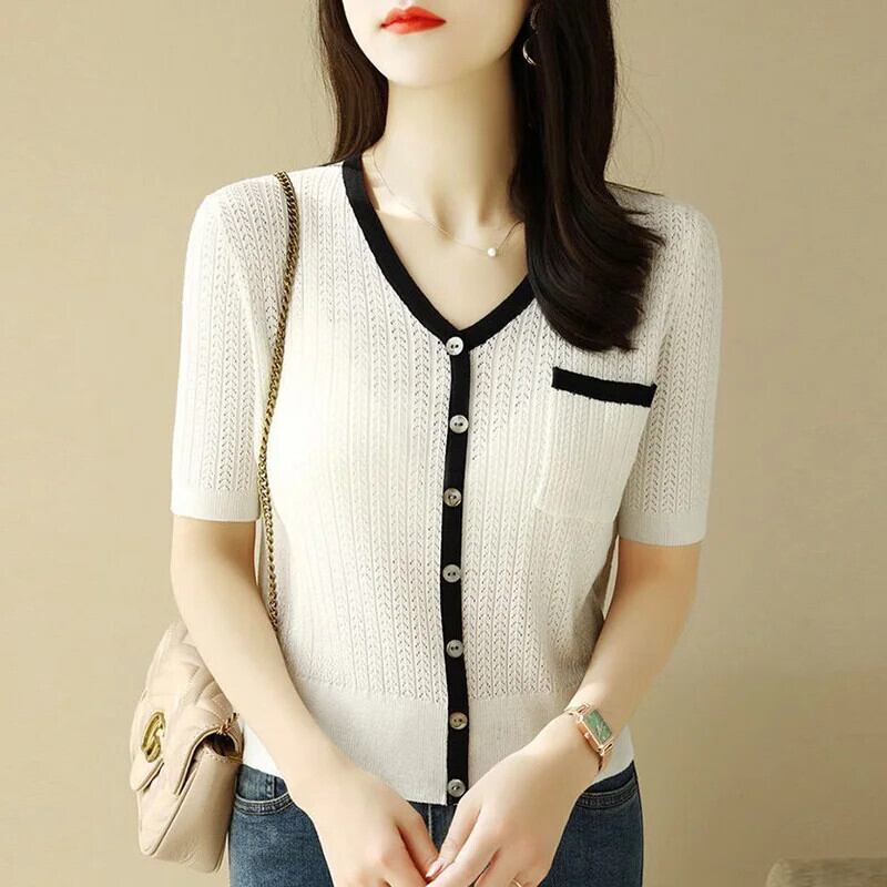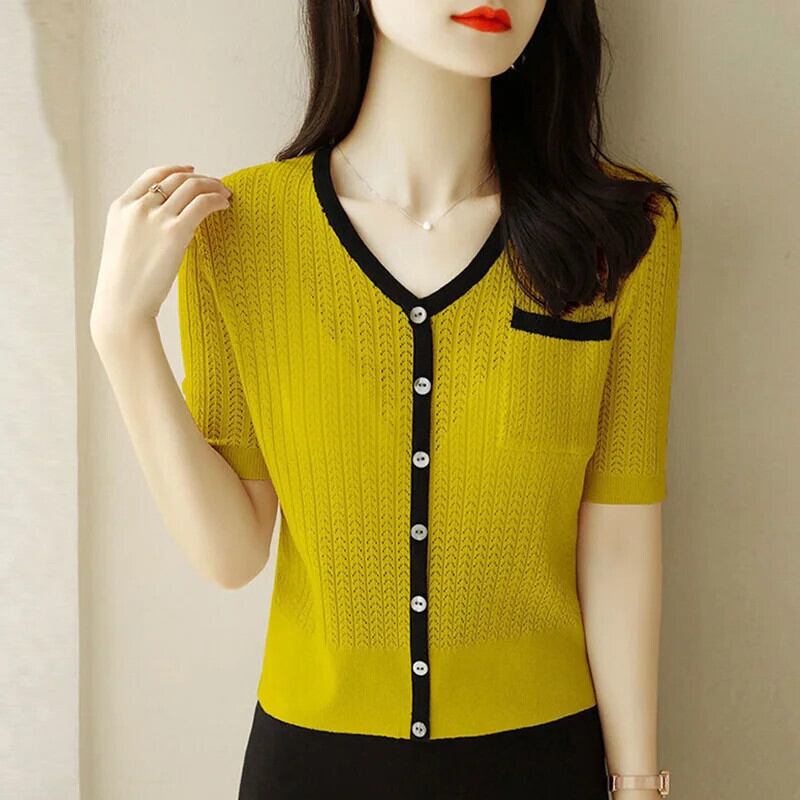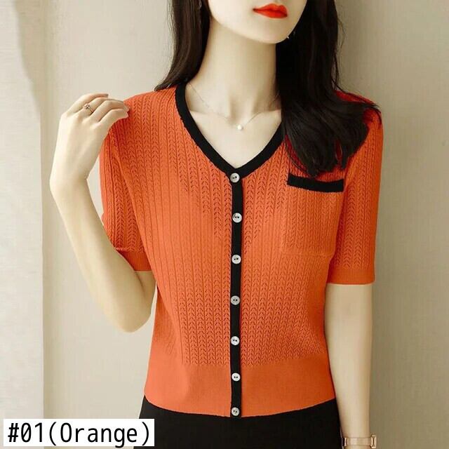 送料無料 V ネックボタンスプライスポケットオールマッチブラウス 2023 夏プルオーバートップスルーズ通勤シャツ サマー 夏物 Vネック AE1288776634502534403