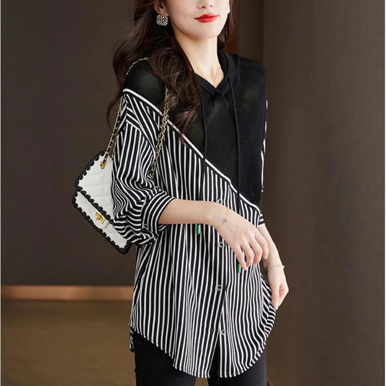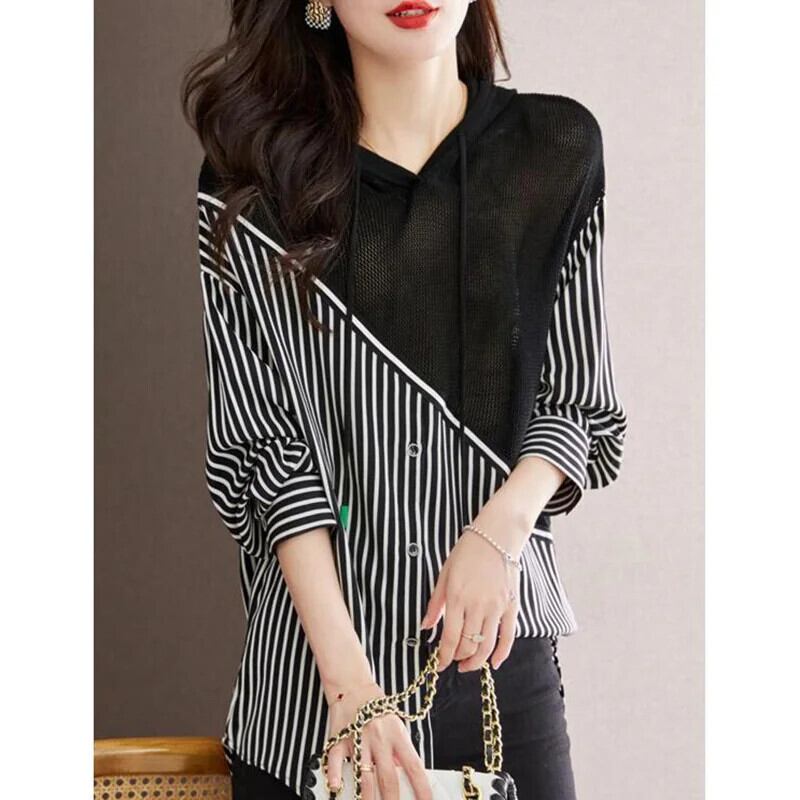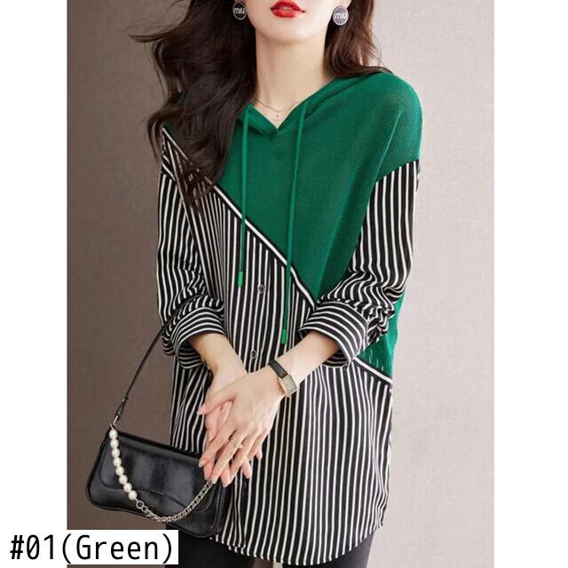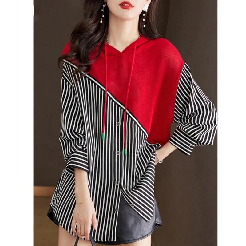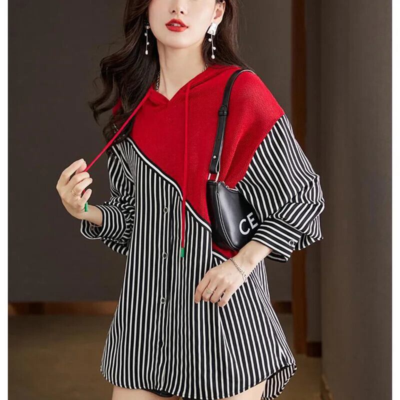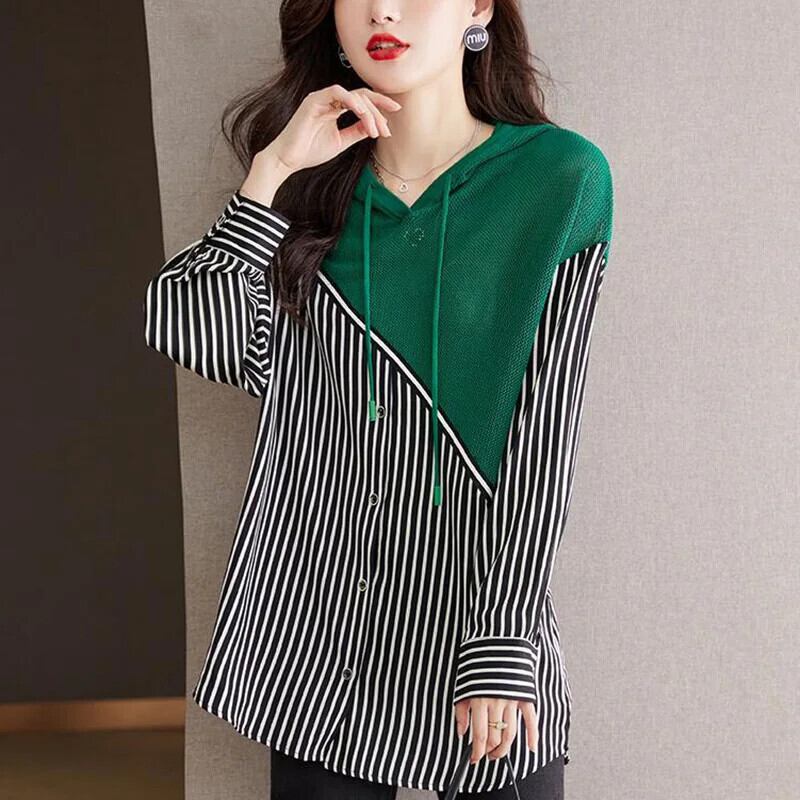 送料無料 フード付きスプライスフェイクツーピースストライプブラウス2023秋ルーズプルオーバー非対称シャツ オータム 秋物 AE128877667032586037