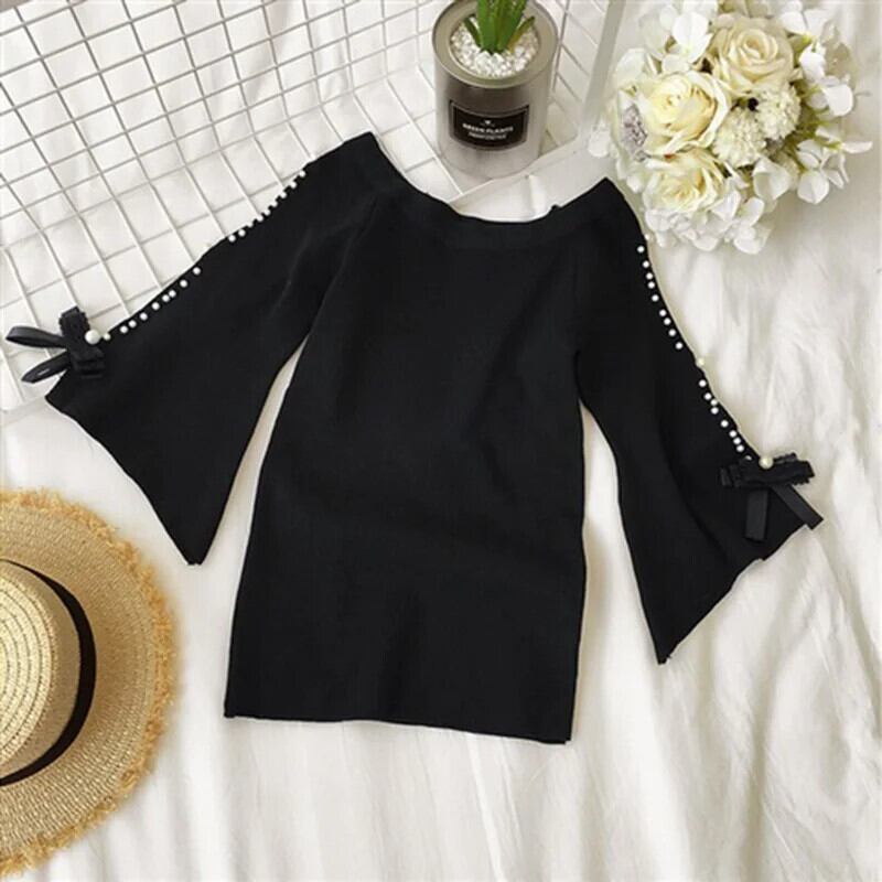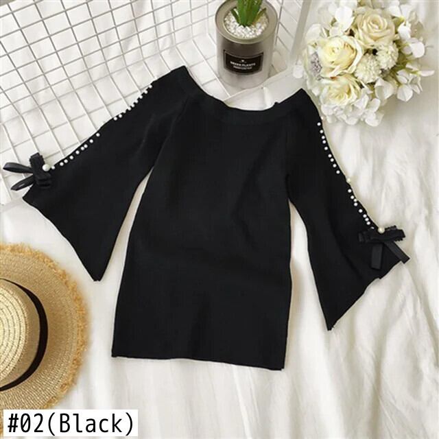 送料無料 スタイリッシュなルーズニットオフショルダーボウビーズブラウス 2023 夏プルオーバー甘いフレアスリーブシャツ リボン 大人ガーリー スウィート キュート カジュアル サマー 夏物 AE1288776660999390716