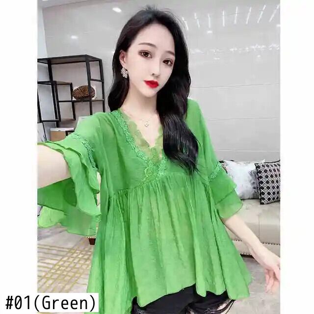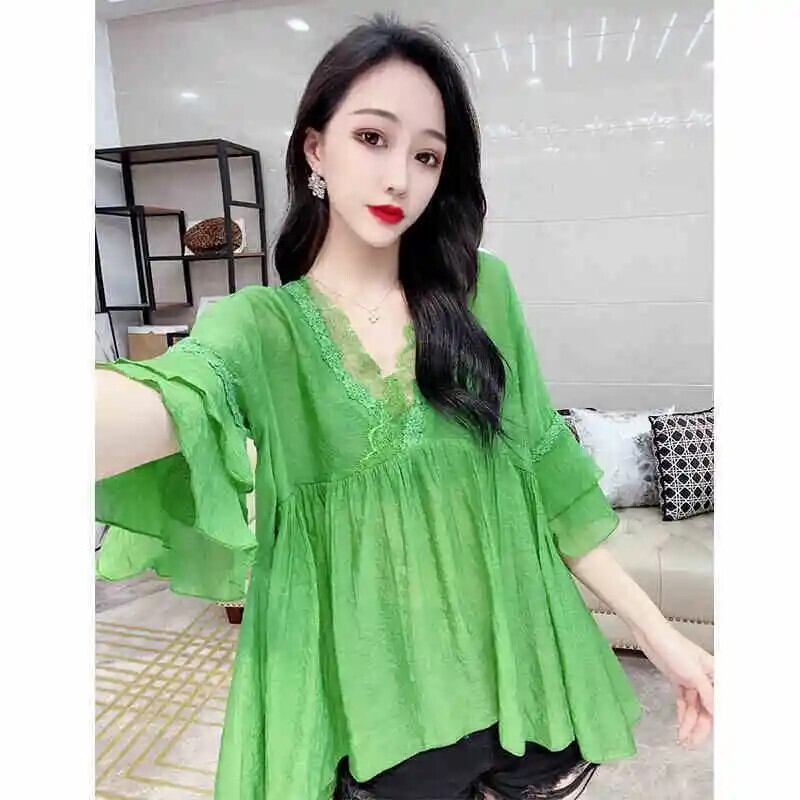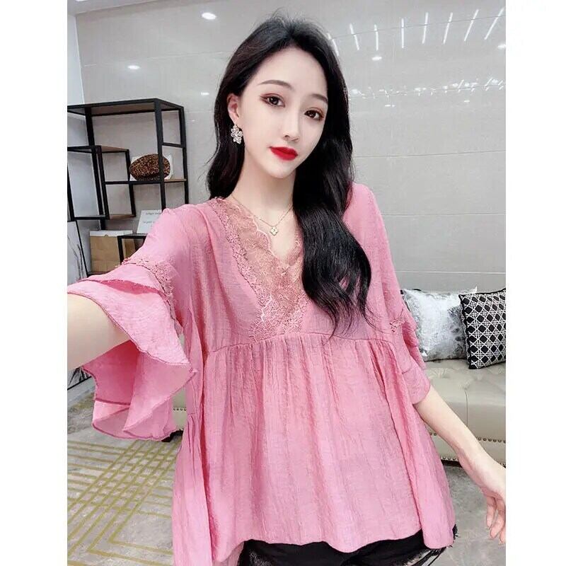 送料無料 スプライスレースルーズ不規則なフレアスリーブブラウス女性の 2023 夏特大プルオーバー甘いシャツ 大人ガーリー スウィート キュート カジュアル サマー 夏物 AE1288776617214594287