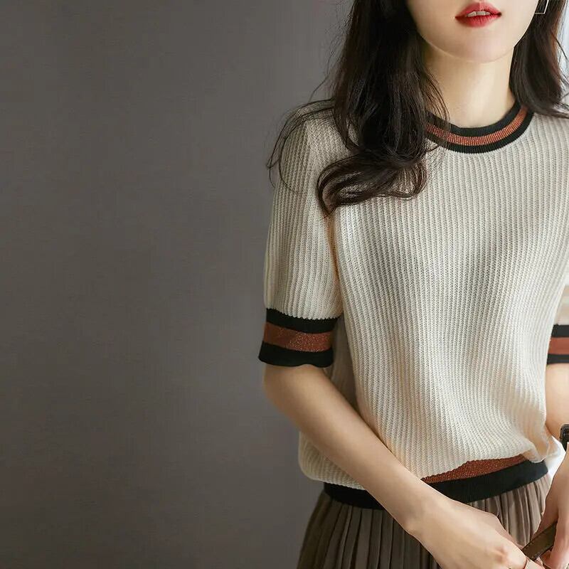 送料無料 O ネックニットスプライシングオールマッチブラウス女性 2023 春ルーズプルオーバー半袖通勤シャツ ショート ハーフスリーブ スプリング 春物 Oネック AE1288776684841937659
