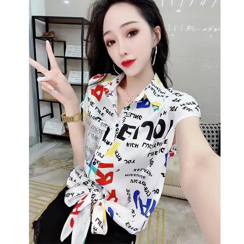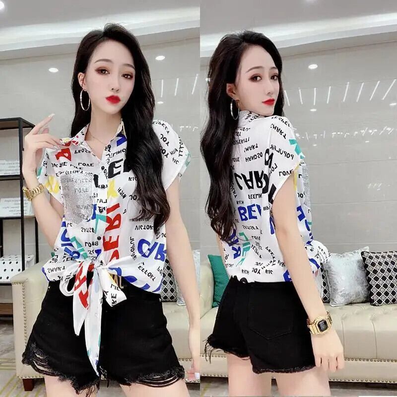 送料無料 ラペルダイヤモンドプリント包帯ボタン特大シフォンシャツルーズ半袖通勤レディースブラウス ショート ハーフスリーブ AE1288776668256601530
