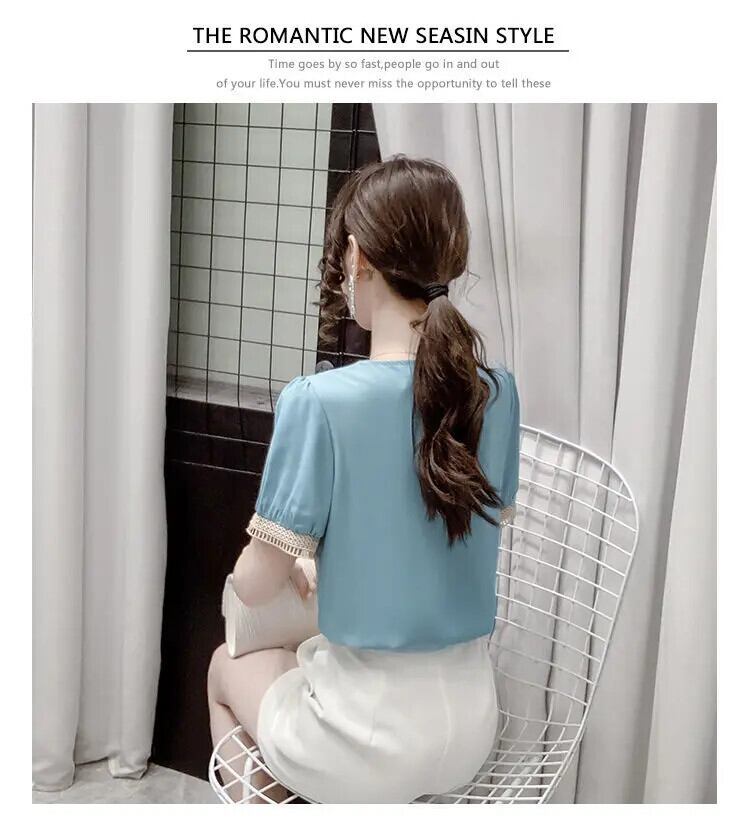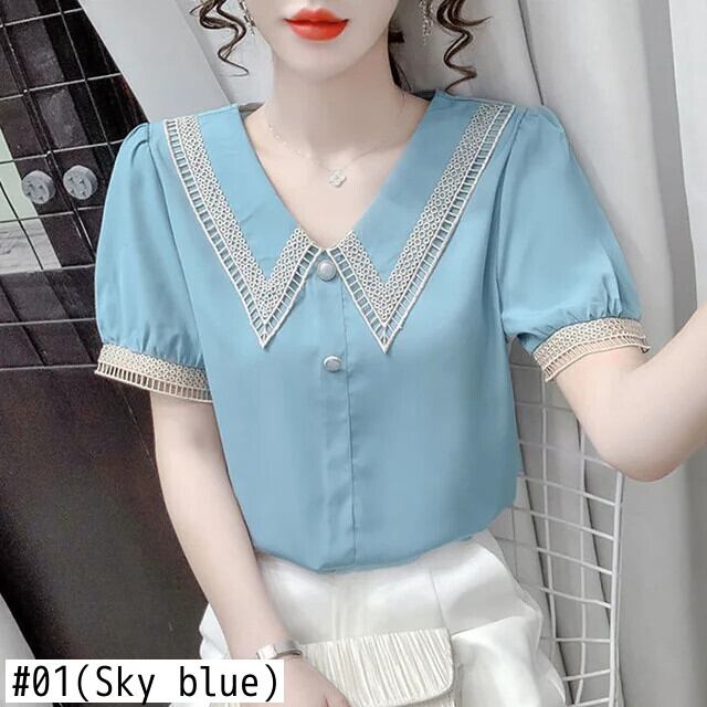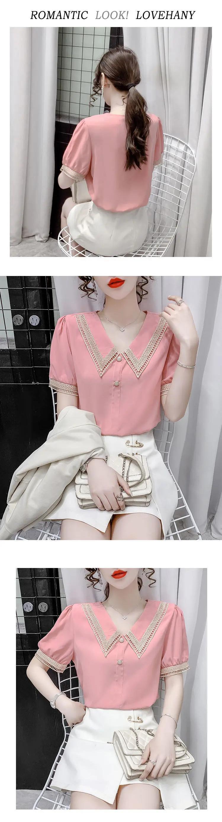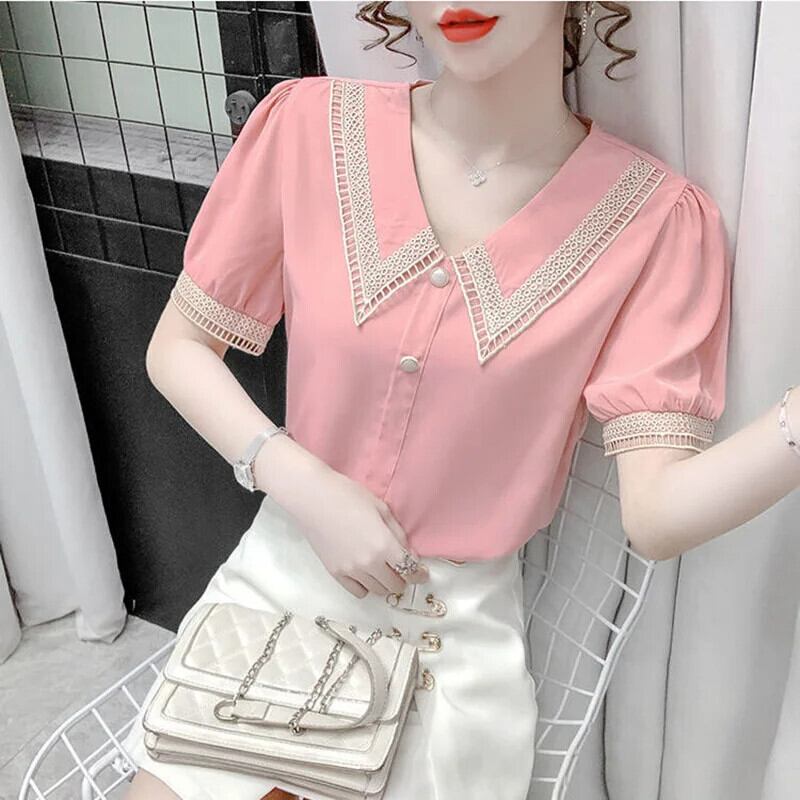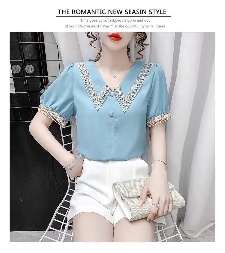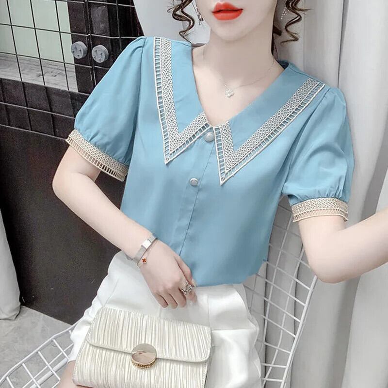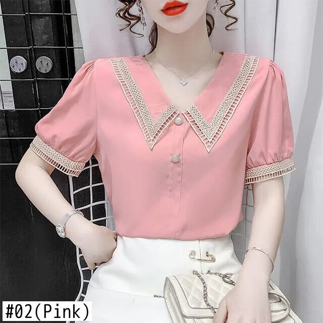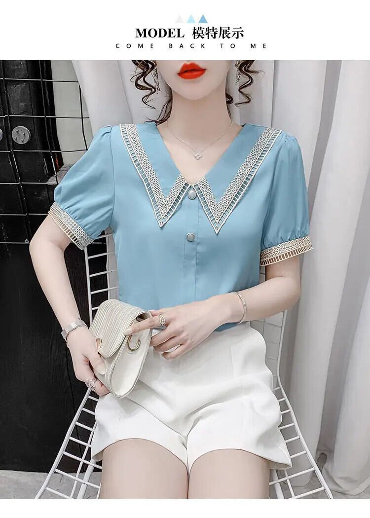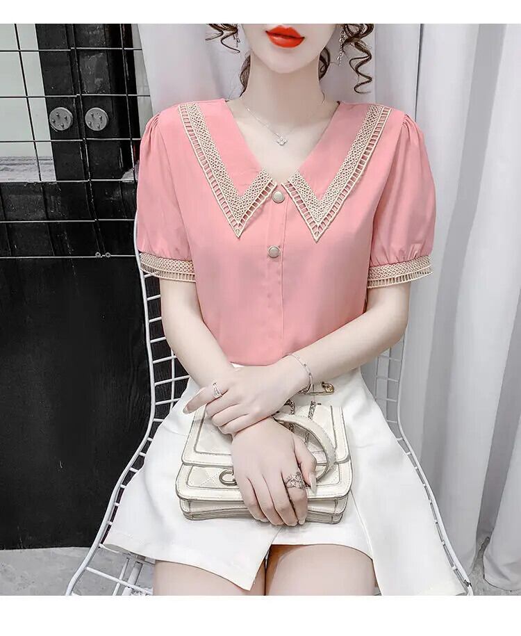 送料無料 甘いピーターパン襟レーススプライス半袖シフォンシャツ特大通勤プルオーバー夏の女性ブラウス ショート ハーフスリーブ 大人ガーリー スウィート キュート カジュアル サマー 夏物 AE1288776685413946009
