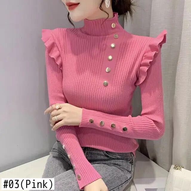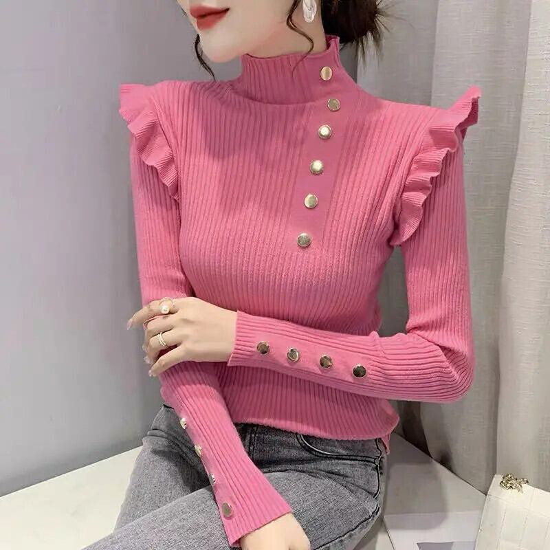送料無料 タートルネックスプライシングボタンフリルブラウス女性の 2023 秋冬ソリッドカラートップス通勤シャツ ラッフル オータム 秋物 ウィンター 冬物 AE1288776677185985422