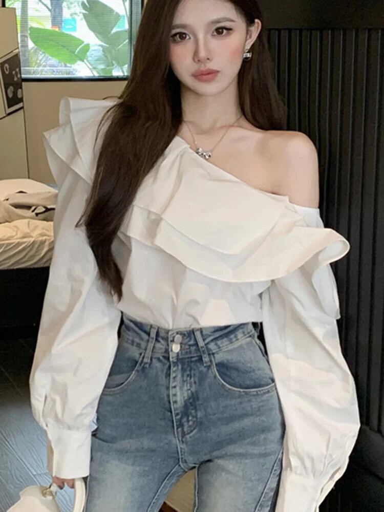 送料無料 スラッシュネックオフショルダーフリル Tシャツレディース 2024 春夏ルーズトップスオフィスレディ Tシャツ ラッフル スプリング 春物 サマー 夏物 会社 学校 通勤や通学にも AE1288776648644014481